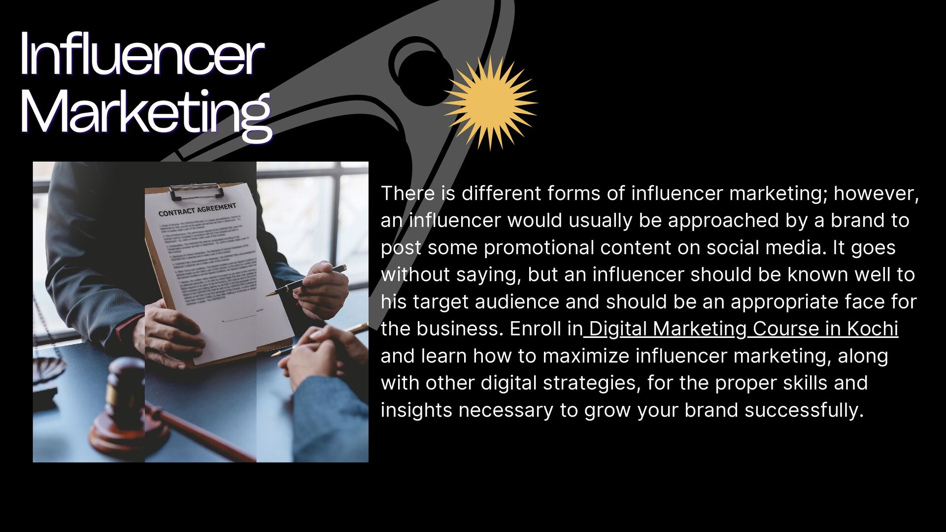 marketing; however, an influencer would usually be approached by a brand to post some promotional content on social media. It goes without saying, but an influencer should be known well to his target audience and should be an appropriate face for the business. Enroll in Digital Marketing Course in Kochi and learn how to maximize influencer marketing, along with other digital strategies, for the proper skills and insights necessary to grow your brand successfully.