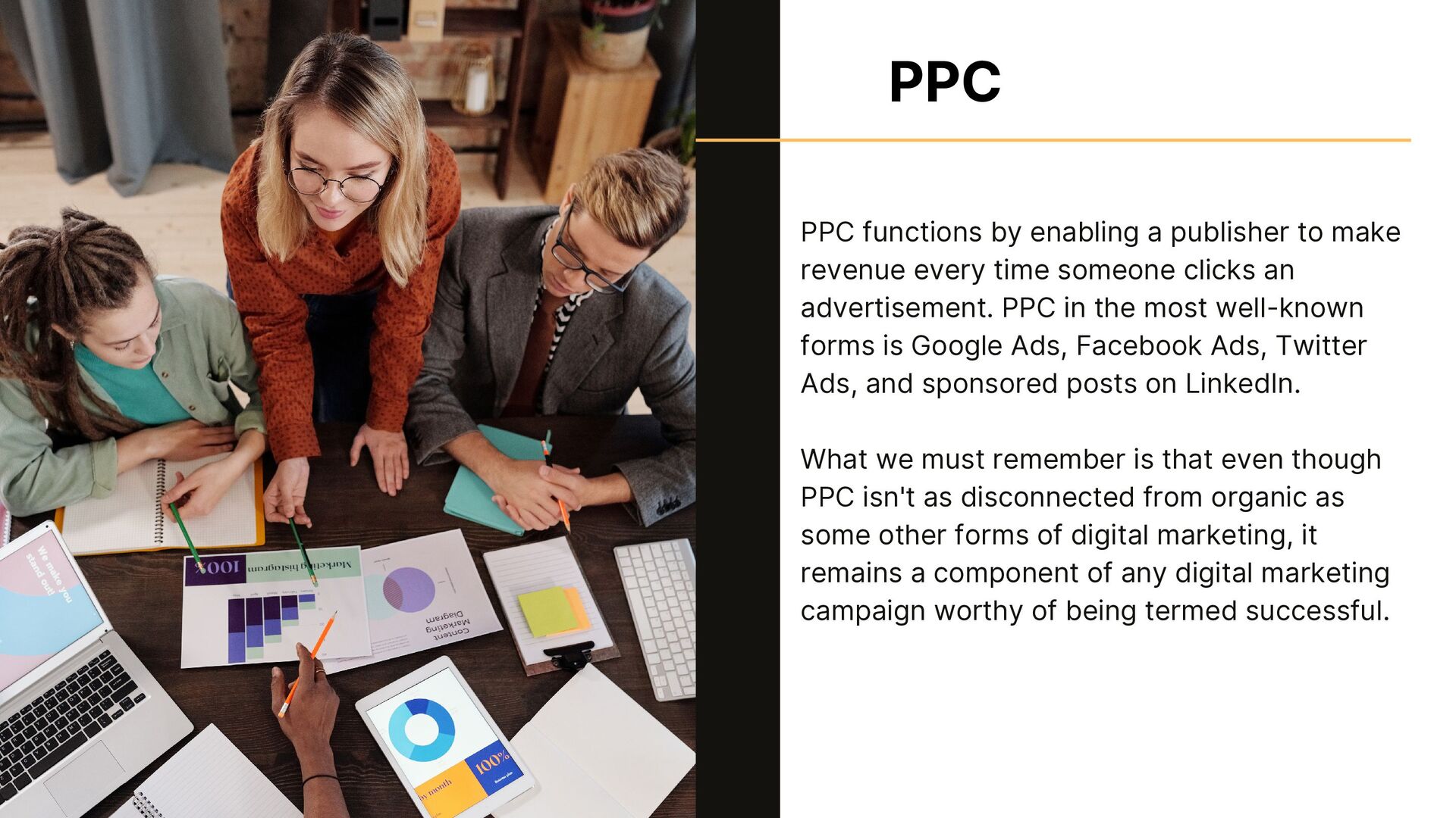 every time someone clicks an advertisement. PPC in the most well-known forms is Google Ads, Facebook Ads, Twitter Ads, and sponsored posts on LinkedIn. What we must remember is that even though PPC isn't as disconnected from organic as some other forms of digital marketing, it remains a component of any digital marketing campaign worthy of being termed successful.