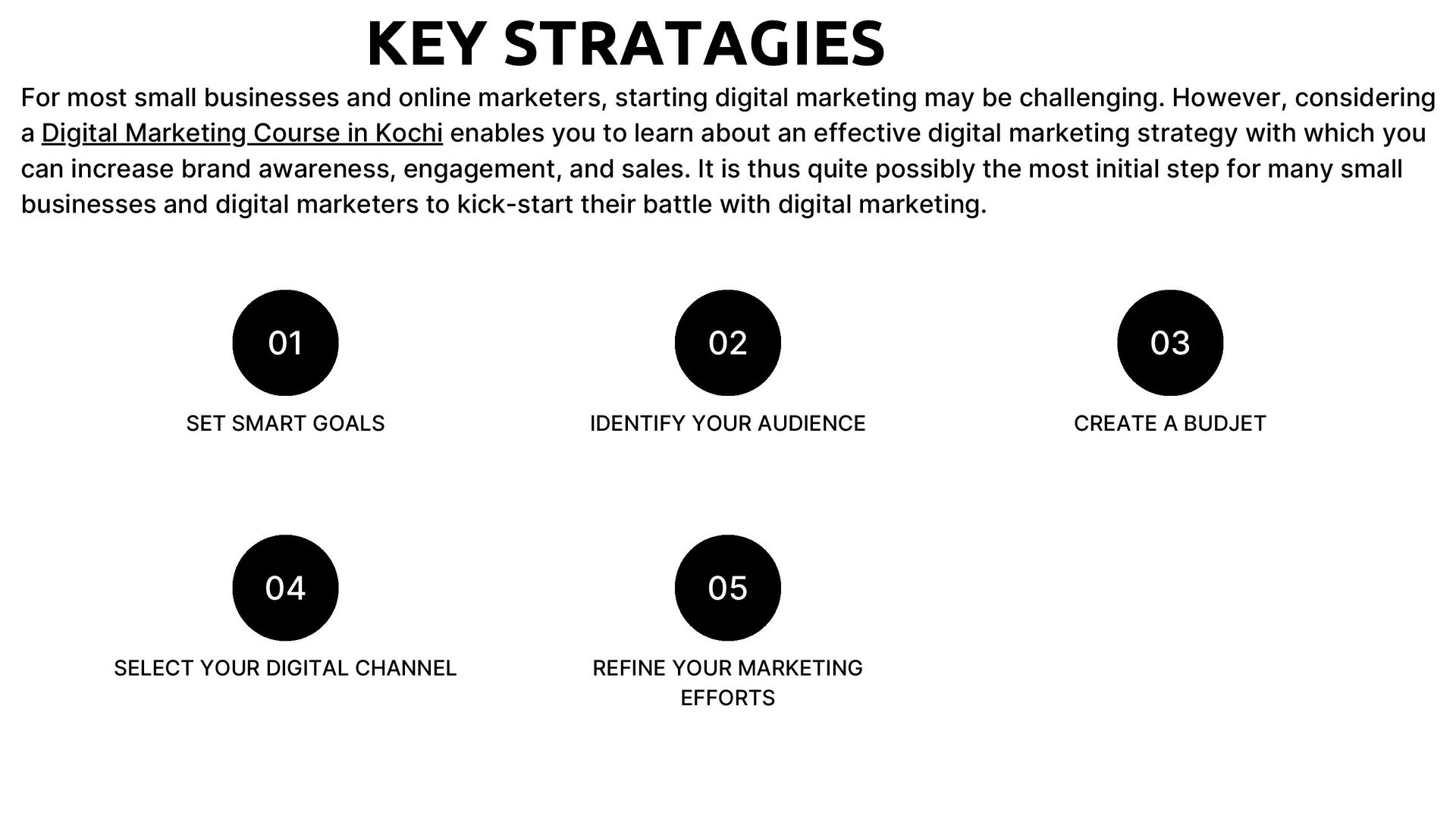 A BUDJET KEY STRATAGIES 04 SELECT YOUR DIGITAL CHANNEL 05 REFINE YOUR MARKETING EFFORTS For most small businesses and online marketers, starting digital marketing may be challenging. However, considering a Digital Marketing Course in Kochi enables you to learn about an effective digital marketing strategy with which you can increase brand awareness, engagement, and sales. It is thus quite possibly the most initial step for many small businesses and digital marketers to kick-start their battle with digital marketing.
