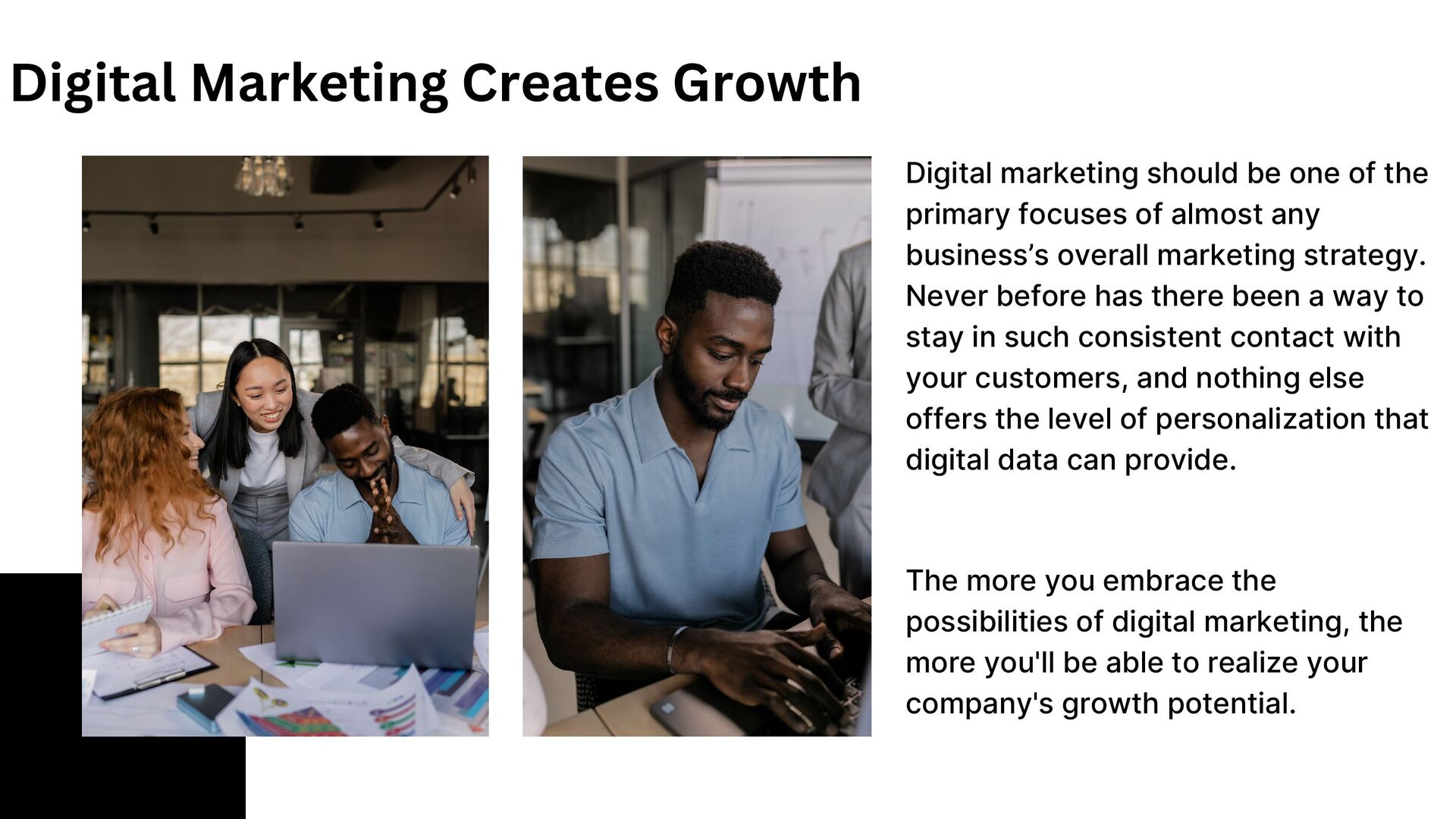 almost any business’s overall marketing strategy. Never before has there been a way to stay in such consistent contact with your customers, and nothing else offers the level of personalization that digital data can provide. The more you embrace the possibilities of digital marketing, the more you'll be able to realize your company's growth potential. Digital Marketing Creates Growth