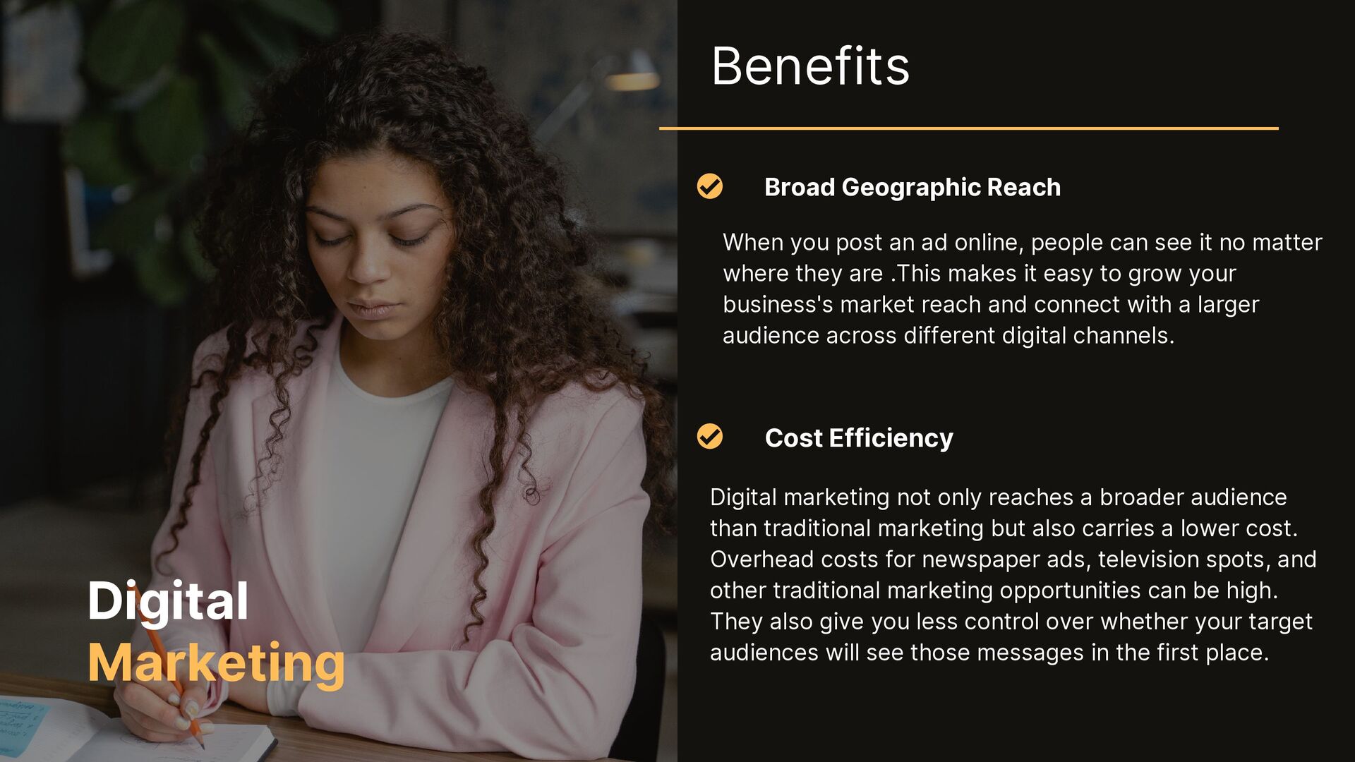 post an ad online, people can see it no matter where they are .This makes it easy to grow your business's market reach and connect with a larger audience across different digital channels. Digital marketing not only reaches a broader audience than traditional marketing but also carries a lower cost. Overhead costs for newspaper ads, television spots, and other traditional marketing opportunities can be high. They also give you less control over whether your target audiences will see those messages in the first place.
