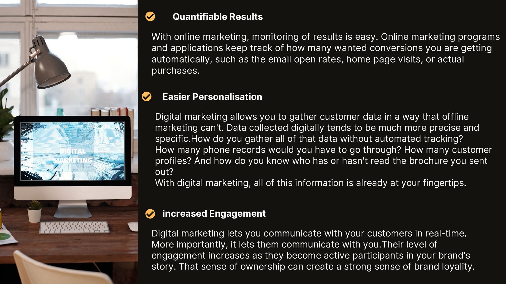 Online marketing programs and applications keep track of how many wanted conversions you are getting automatically, such as the email open rates, home page visits, or actual purchases. Easier Personalisation Digital marketing allows you to gather customer data in a way that offline marketing can't. Data collected digitally tends to be much more precise and specific.How do you gather all of that data without automated tracking? How many phone records would you have to go through? How many customer profiles? And how do you know who has or hasn't read the brochure you sent out? With digital marketing, all of this information is already at your fingertips. increased Engagement Digital marketing lets you communicate with your customers in real-time. More importantly, it lets them communicate with you.Their level of engagement increases as they become active participants in your brand's story. That sense of ownership can create a strong sense of brand loyality.