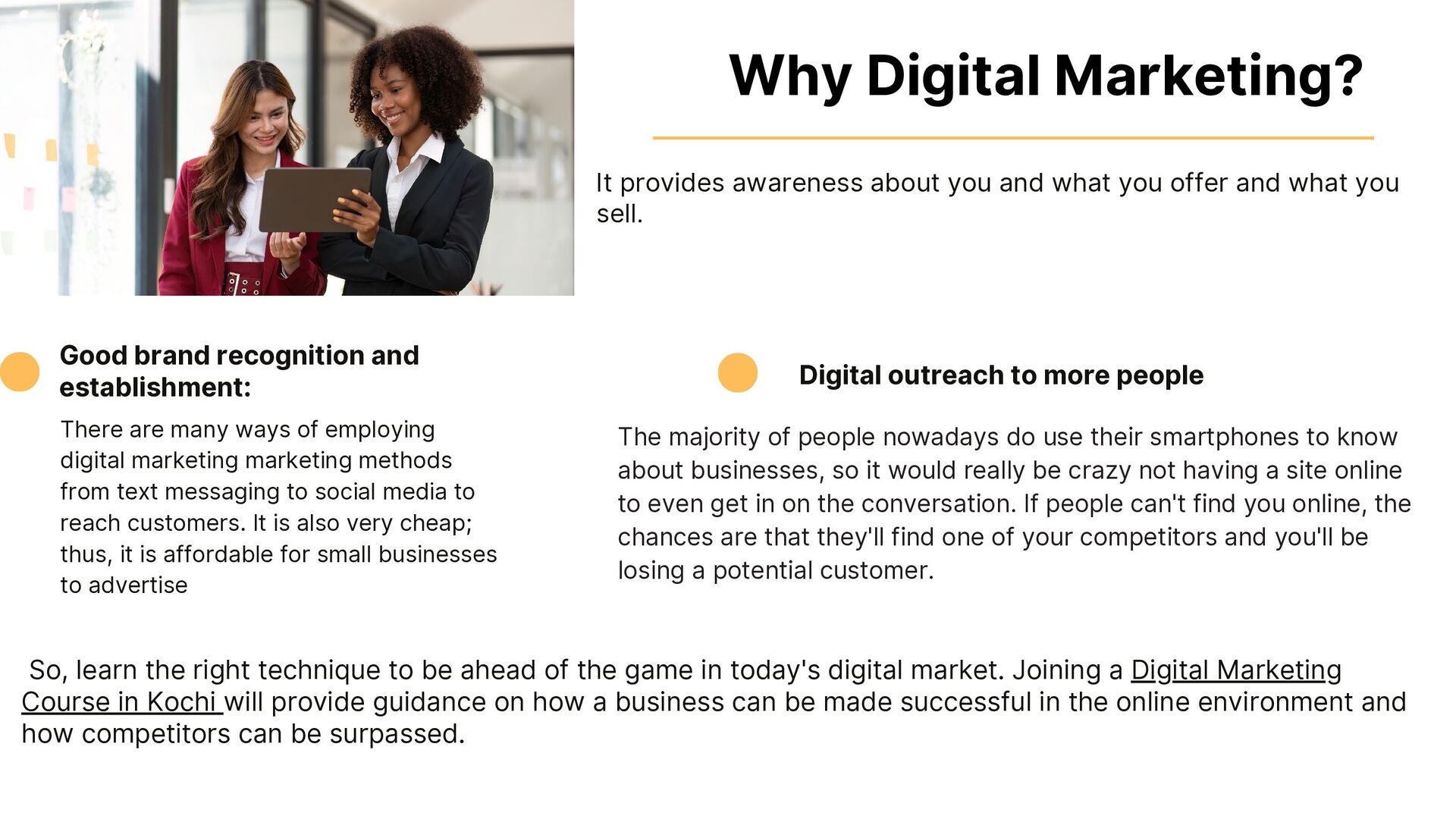 to more people There are many ways of employing digital marketing marketing methods from text messaging to social media to reach customers. It is also very cheap; thus, it is affordable for small businesses to advertise The majority of people nowadays do use their smartphones to know about businesses, so it would really be crazy not having a site online to even get in on the conversation. If people can't find you online, the chances are that they'll find one of your competitors and you'll be losing a potential customer. It provides awareness about you and what you offer and what you sell. So, learn the right technique to be ahead of the game in today's digital market. Joining a Digital Marketing Course in Kochi will provide guidance on how a business can be made successful in the online environment and how competitors can be surpassed.