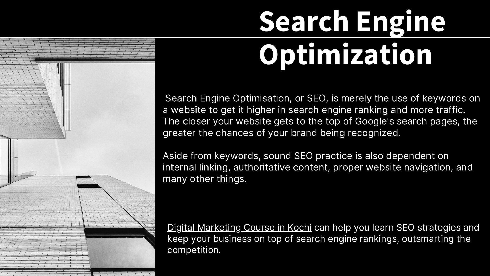 the use of keywords on a website to get it higher in search engine ranking and more traffic. The closer your website gets to the top of Google's search pages, the greater the chances of your brand being recognized. Aside from keywords, sound SEO practice is also dependent on internal linking, authoritative content, proper website navigation, and many other things. Digital Marketing Course in Kochi can help you learn SEO strategies and keep your business on top of search engine rankings, outsmarting the competition.