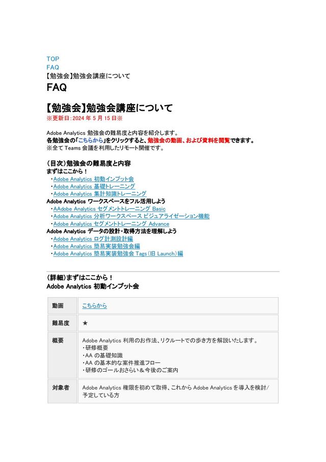 事前学 習 ・[AA]基礎知識:申請・関連サイト一覧 ・[AA]基礎知識:[AA]利用ルール ・[AA]基礎知識:[AA]コスト ・[AA]計測設計・実装:主な役割と必要な知識 ・[AA]計測設計・実装:計測設計・実装の流れ Adobe Analytics 基礎トレーニング