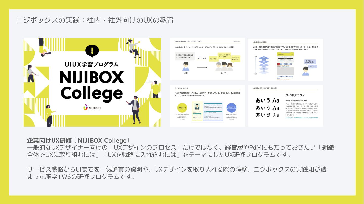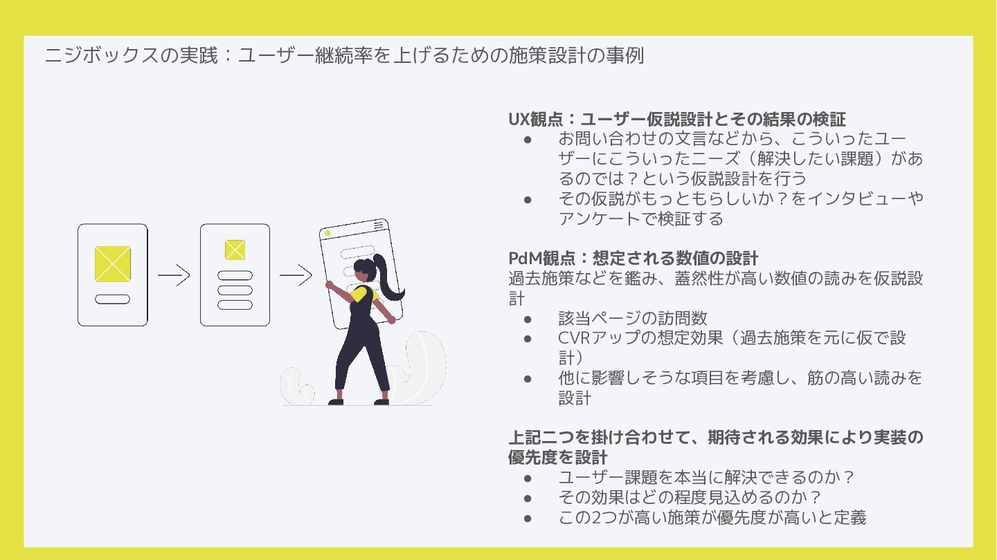 1. ニジボックスの実践:ユーザー継続率を上げるための施策設計の事例 UX観点:ユーザー仮説設計とその結果の検証 • お問い合わせの文言などから、こういったユー ザーにこういったニーズ(解決したい課題)があ るのでは?という仮説設計を行う • その仮説がもっともらしいか?をインタビューや アンケートで検証する PdM観点:想定される数値の設計