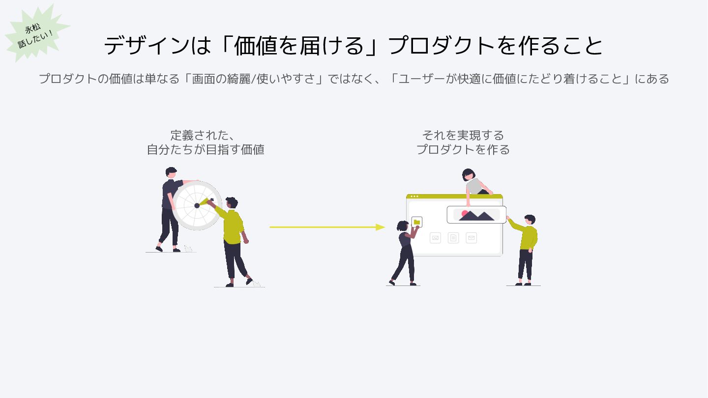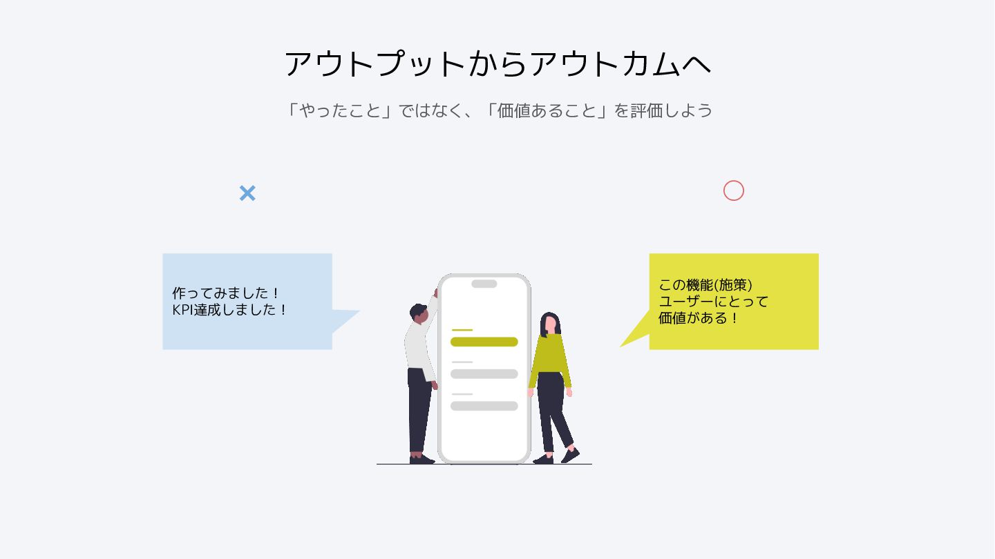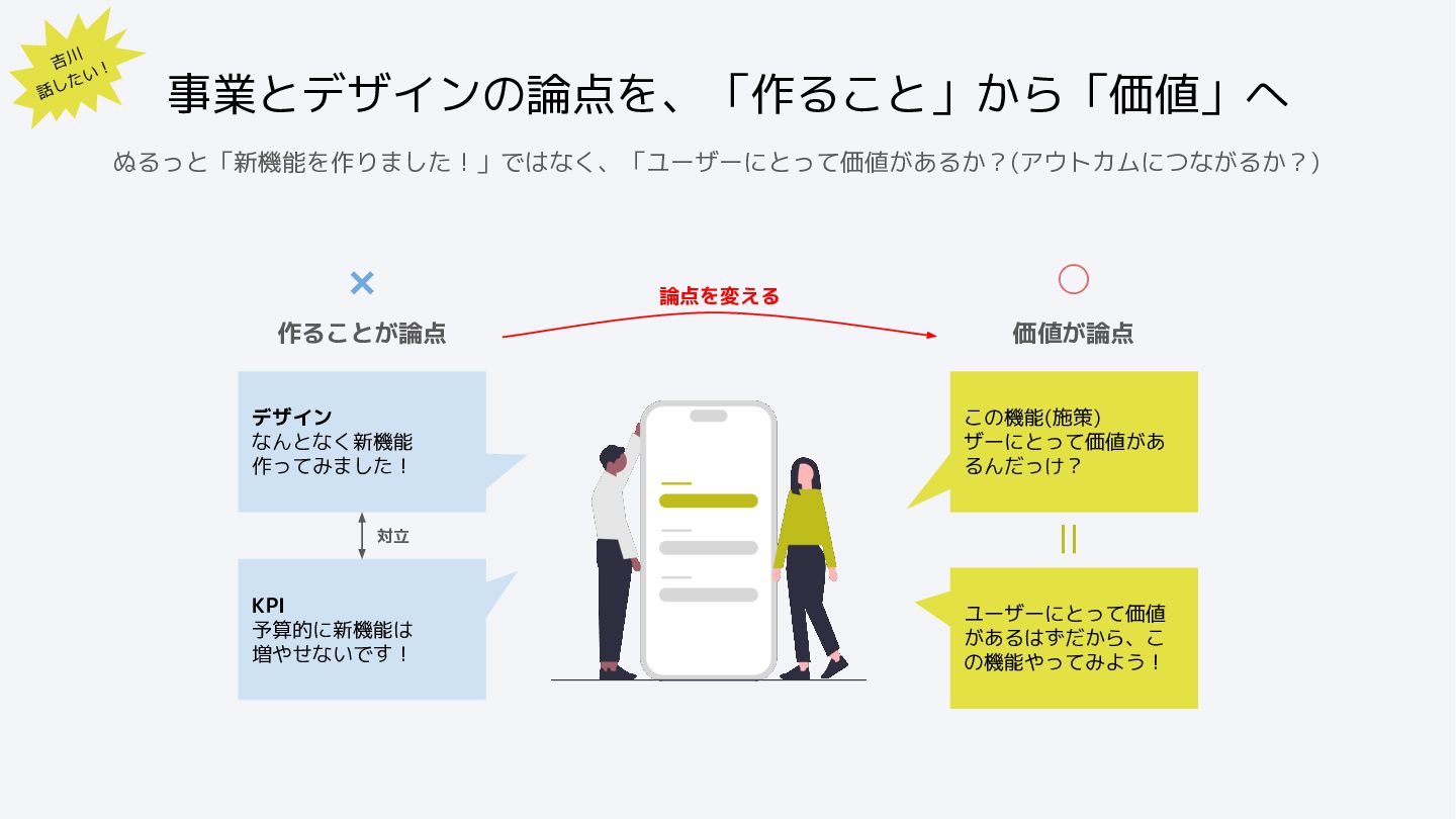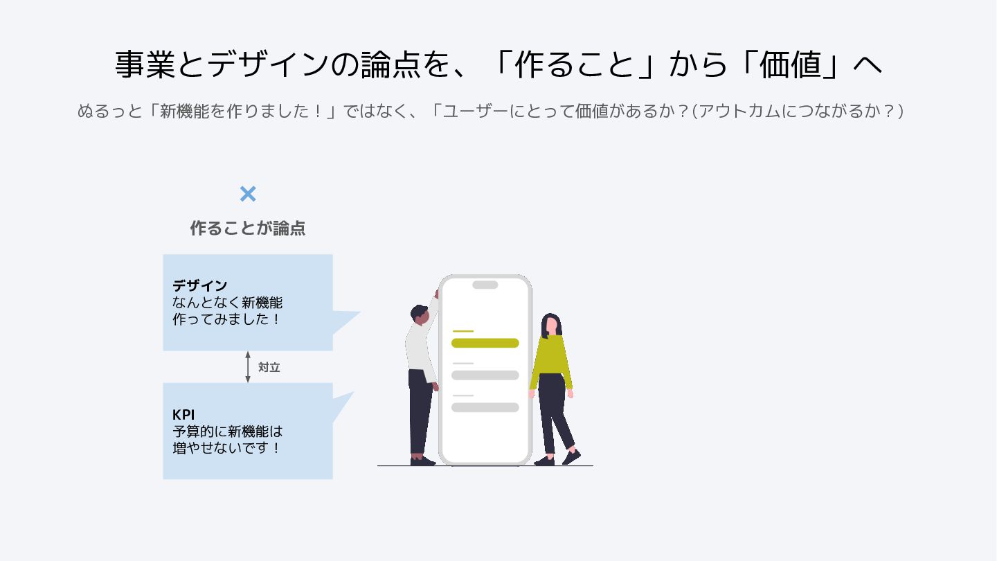 俺はこっちだと思う 社長の鶴の一声が! これはユーザーにとっ て価値がある新機能だ と思います。 ここを変えたらもっと 価値が出るかも! 社長も納得してます!