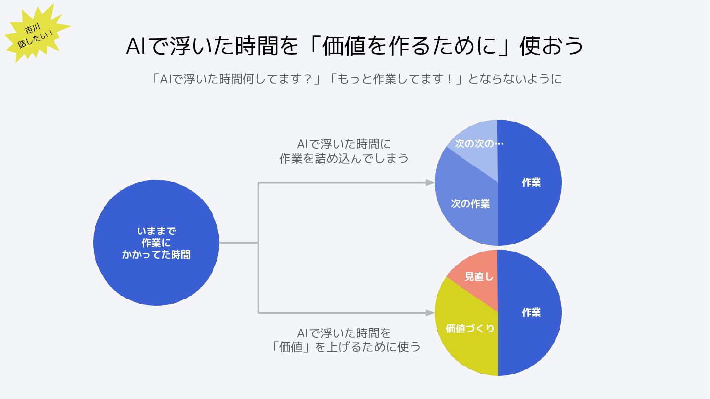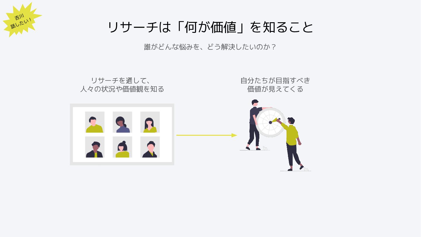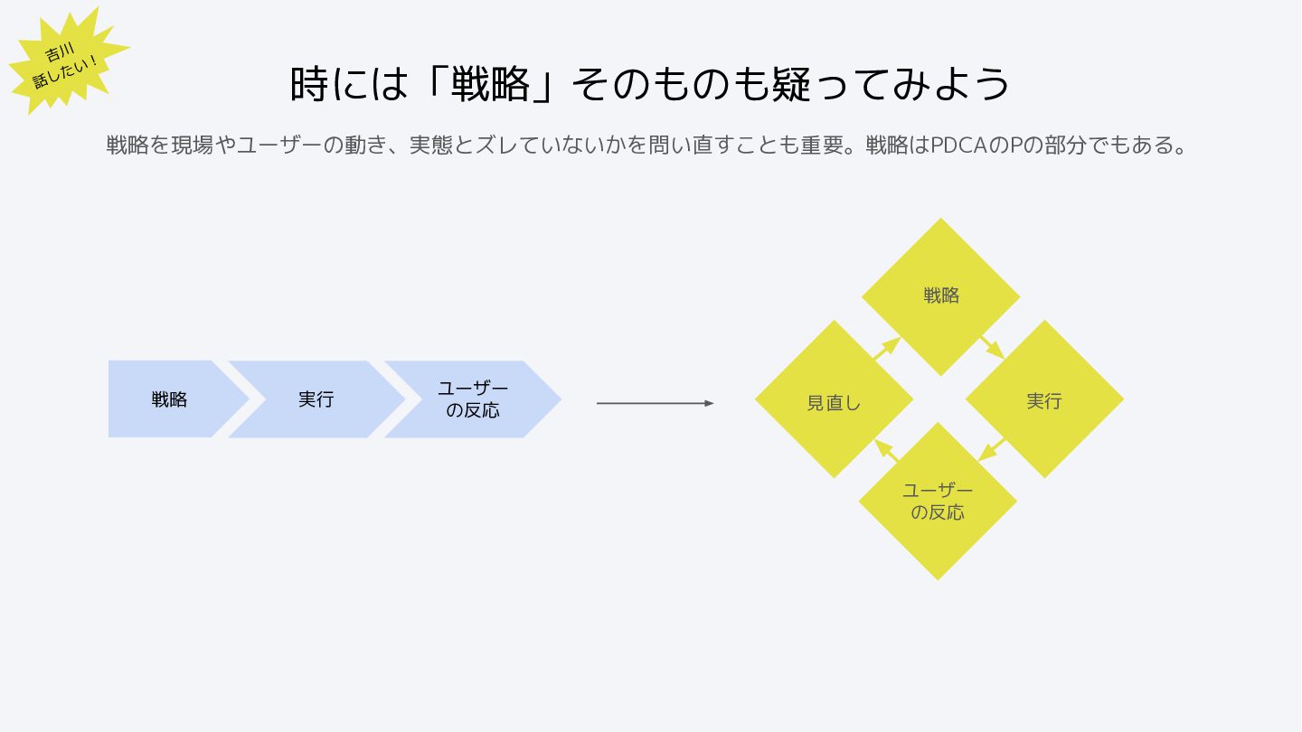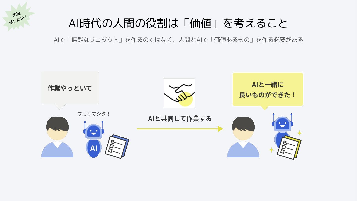 俺はこっちだと思う 社長の鶴の一声が! これはユーザーにとっ て価値がある新機能だ と思います。 ここを変えたらもっと 価値が出るかも! 社長も納得してます!