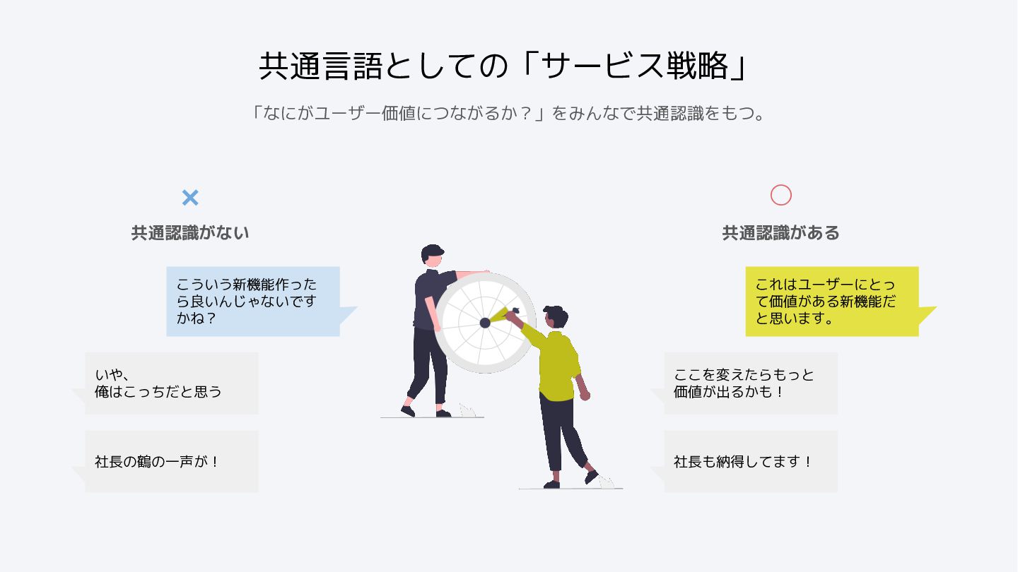 2. 共通言語としての「サービス戦略」 「なにがユーザー価値につながるか?」をみんなで共通認識をもつ。 共通認識がない 共通認識がある × ◦ こういう新機能作った ら良いんじゃないです かね? いや、