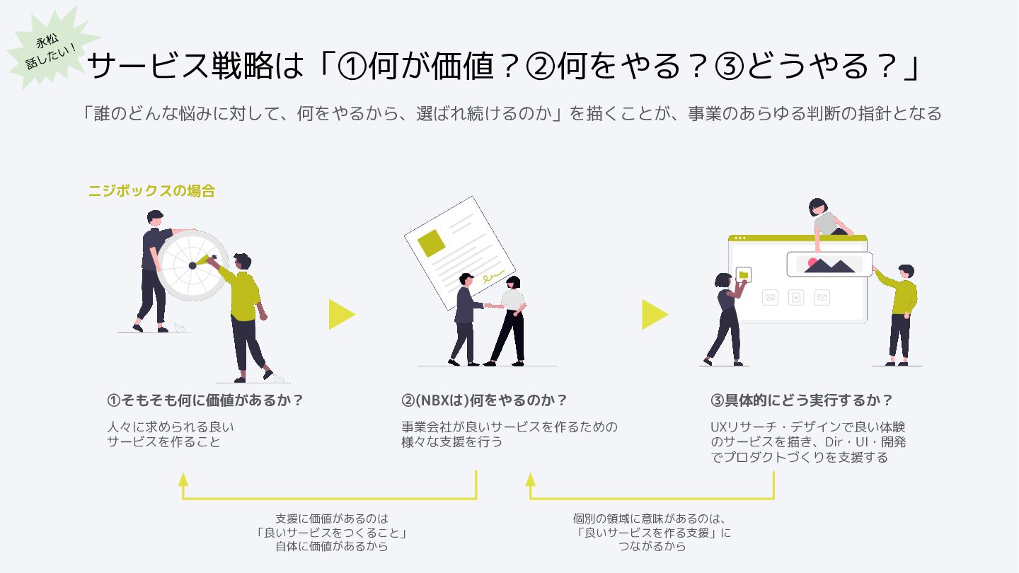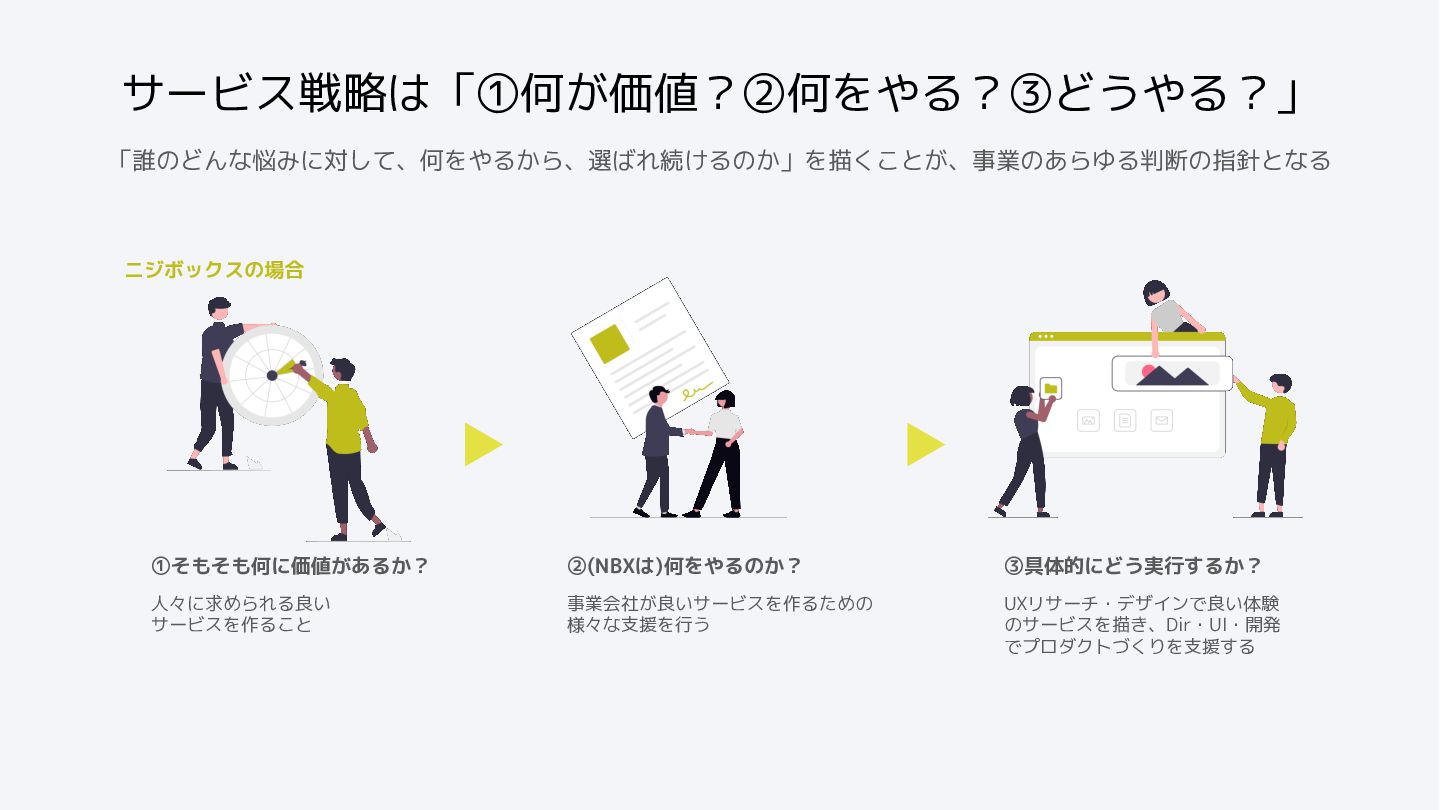 人々に求められる良い サービスを作ること 支援に価値があるのは 「良いサービスをつくること」 自体に価値があるから 個別の領域に意味があるのは、 「良いサービスを作る支援」に つながるから ③具体的にどう実行するか? ①そもそも何に価値があるか? ニジボックスの場合