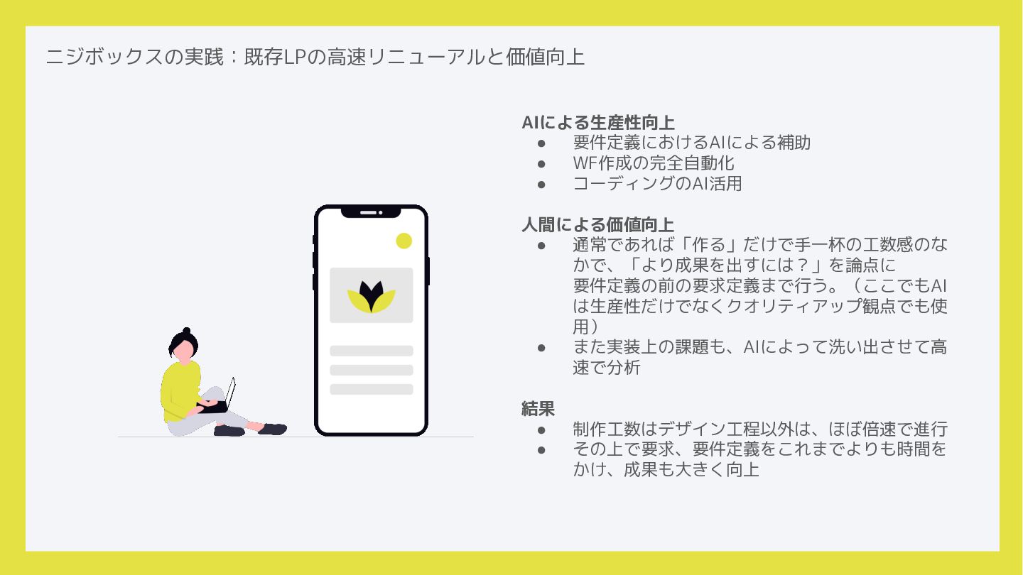 通常であれば「作る」だけで手一杯の工数感のな かで、「より成果を出すには?」を論点に 要件定義の前の要求定義まで行う。(ここでもAI は生産性だけでなくクオリティアップ観点でも使 用) • また実装上の課題も、AIによって洗い出させて高 速で分析 結果 • 制作工数はデザイン工程以外は、ほぼ倍速で進行 • その上で要求、要件定義をこれまでよりも時間を かけ、成果も大きく向上