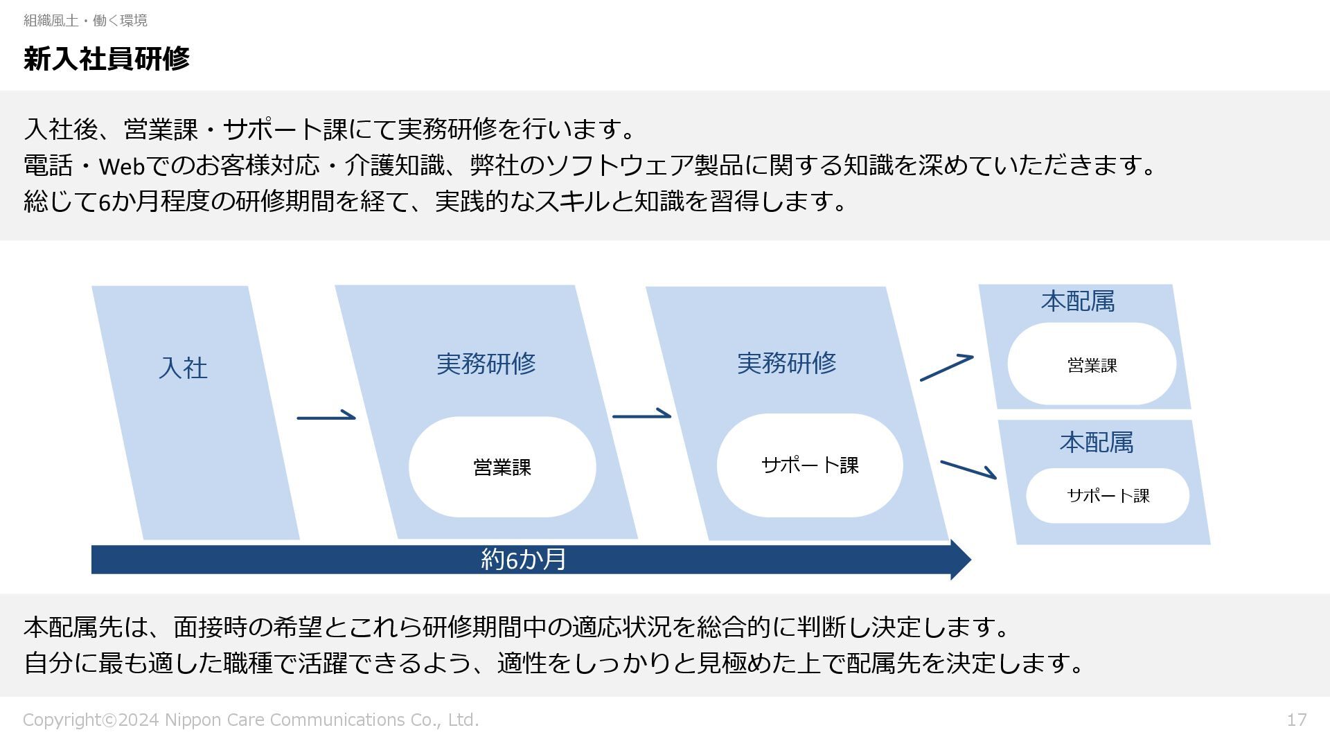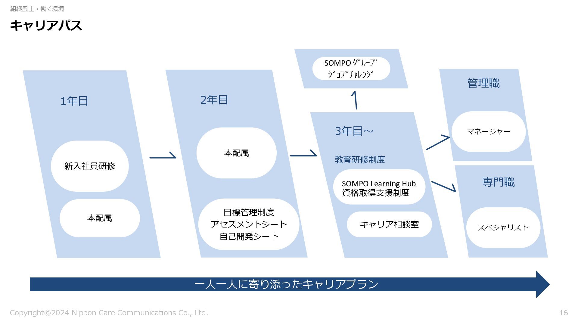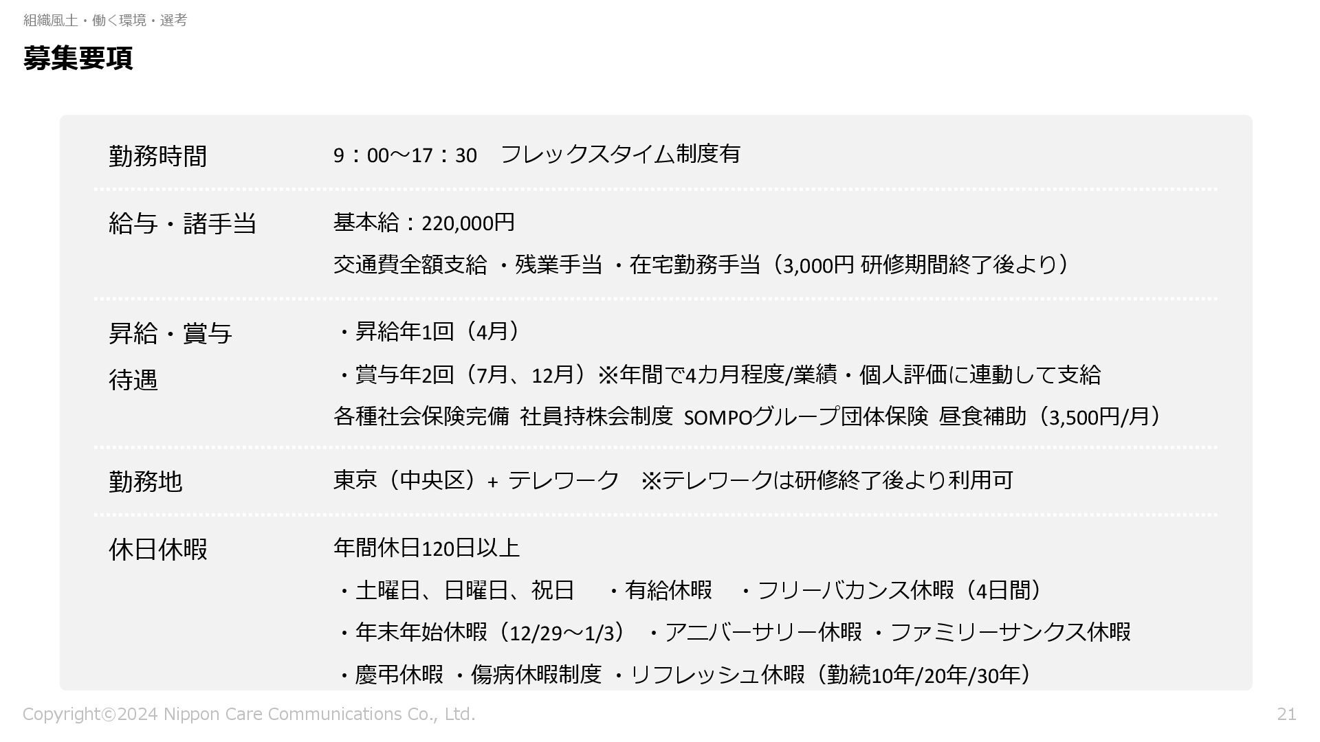 9:00~17:30 フレックスタイム制度有 給与・諸手当 基本給:220,000円 交通費全額支給 ・残業手当 ・在宅勤務手当(3,000円 研修期間終了後より) 昇給・賞与 待遇 ・昇給年1回(4月) ・賞与年2回(7月、12月)※年間で4カ月程度/業績・個人評価に連動して支給 各種社会保険完備 社員持株会制度 SOMPOグループ団体保険 昼食補助(3,500円/月) 勤務地 東京(中央区)+ テレワーク ※テレワークは研修終了後より利用可 休日休暇 年間休日120日以上 ・土曜日、日曜日、祝日 ・有給休暇 ・フリーバカンス休暇(4日間) ・年末年始休暇(12/29~1/3) ・アニバーサリー休暇 ・ファミリーサンクス休暇 ・慶弔休暇 ・傷病休暇制度 ・リフレッシュ休暇(勤続10年/20年/30年)