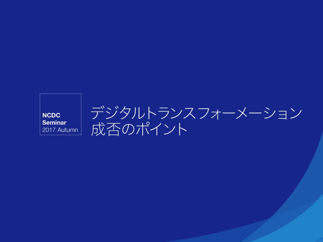 2017年11月22日開催しました「デジタルトランスフォーメーション成否のポイントセミナー」のセッション1「デジタルトランスフォーメーション概要とNCDCの進め方紹介」/NCデザイン&コンサルティング株式会社 代表取締役 早津俊秀の資料です。本資料に関するお問い合わせは、NCデザイン&コンサルティング株式会社([email protected])までご連絡ください。