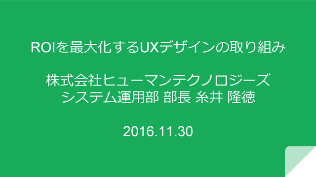 2016年11月30日開催しました「企業システム・サービスのためのUXデザイン最新事例セミナー」のセッション2「「KING OF TIME」のUXデザイン成功事例〜ROIを最大化するUXデザインの取り組み〜」/株式会社ヒューマンテクノロジーズ システム運用部 部長 糸井隆徳様の資料です。本資料に関するお問い合わせは、NCデザイン&コンサルティング株式会社([email protected])までご連絡ください。
