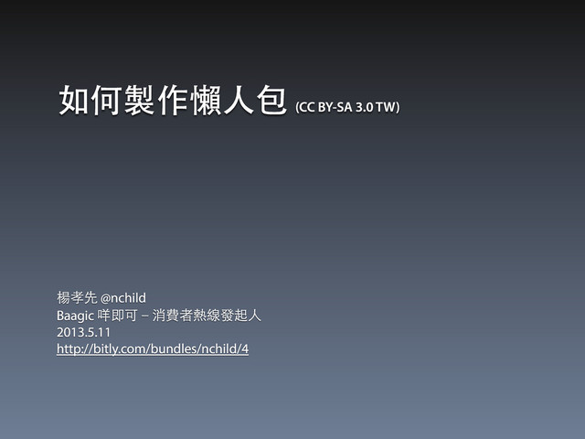 楊孝先 @nchild Baagic 咩即可-消費者熱線發起⼈人 2013.5.11 http://bitly.com/bundles/nchild/4 如何製作懶⼈人包 (CC BY-SA 3.0