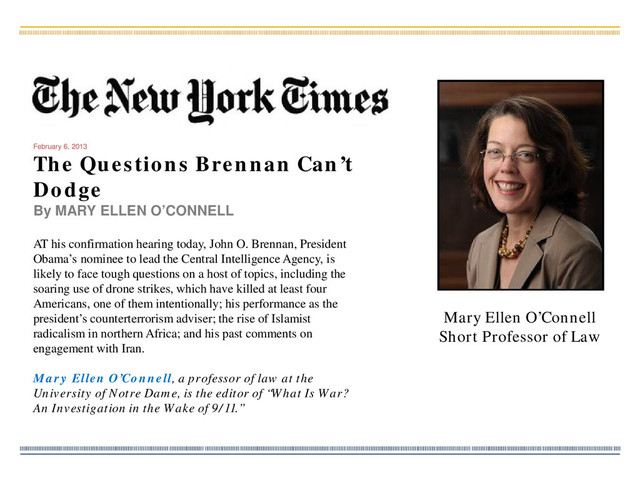 O’Connell, a law professor at the University of Notre Dame, is a determined and eloquent critic of drone strikes. She believes that while strikes in well-defined battle spaces like Iraq and Afghanistan are justified, and can limit civilian deaths, strikes in Pakistan, Yemen, Somalia, and other places amount to “extrajudicial killing,” no matter who the targets are. Such killings are outside the boundary of armed conflict, she says, and hence violate international law. Mary Ellen O’Connell Short Professor of Law