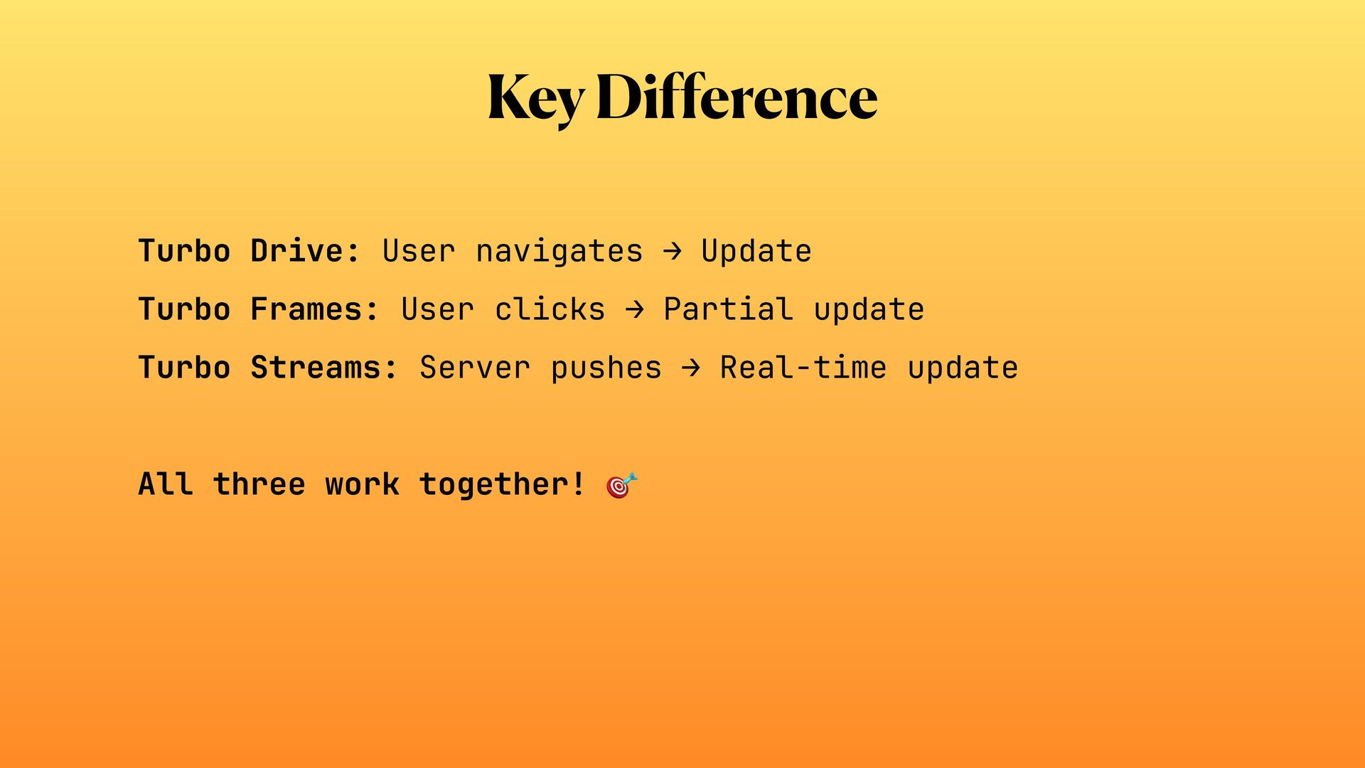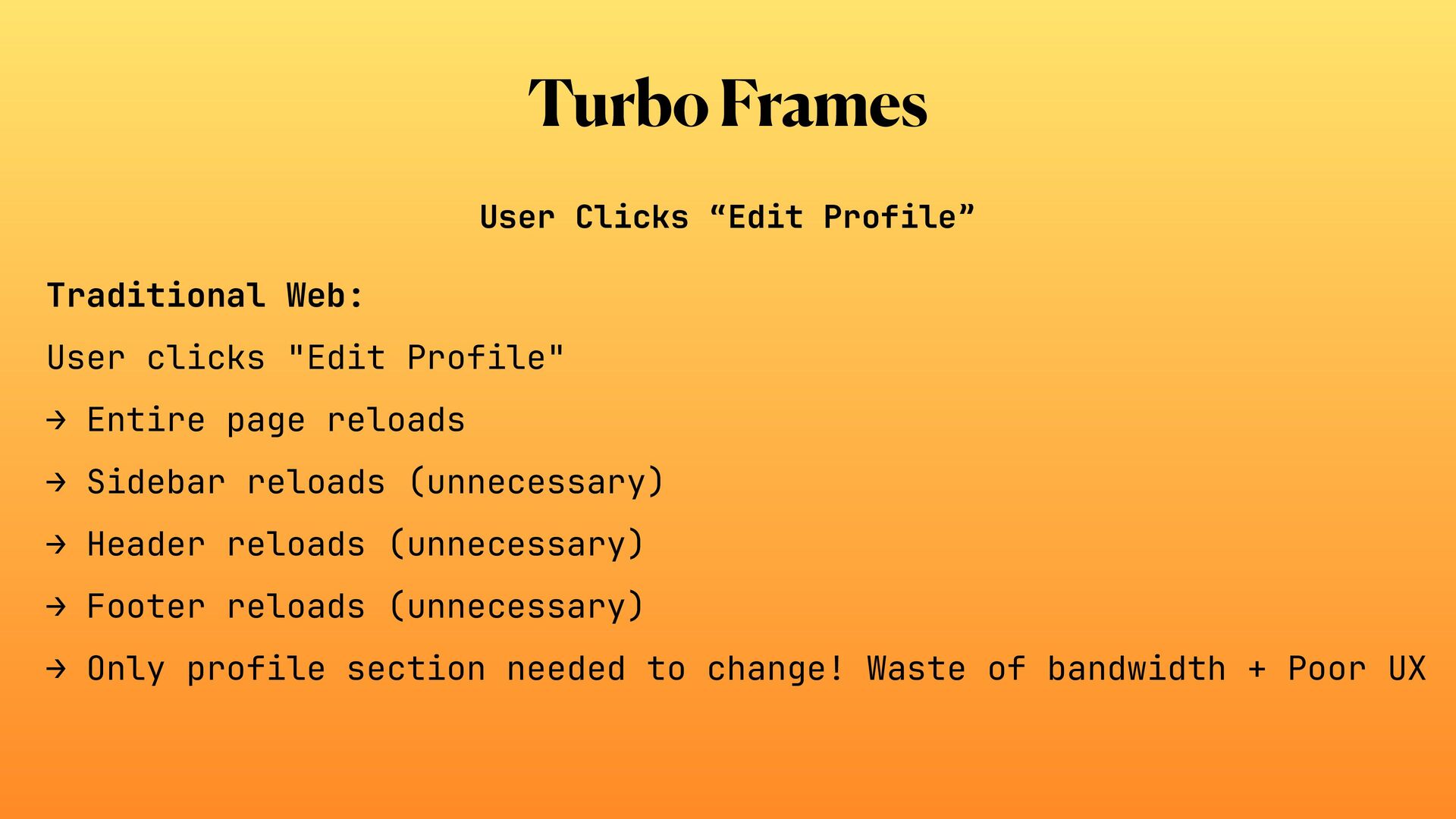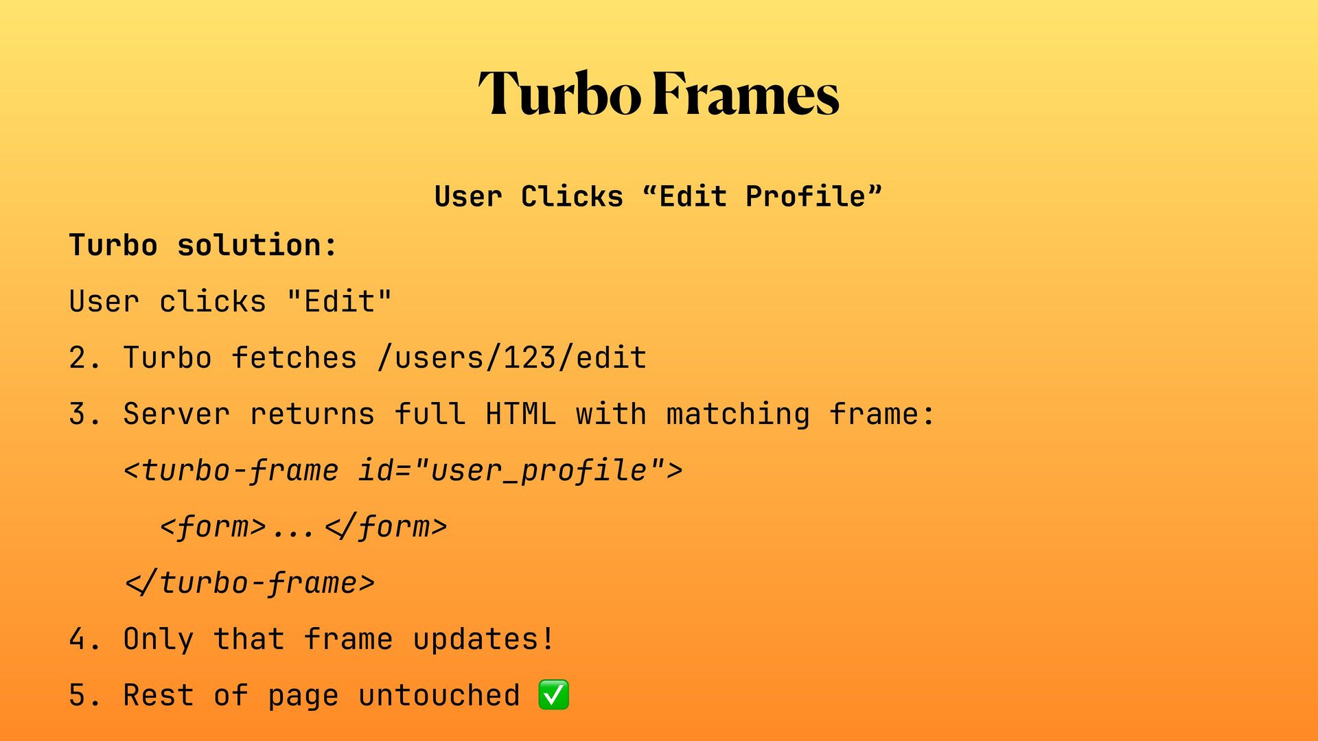 "Edit" 2. Turbo fetches /users/123/edit 3. Server returns full HTML with matching frame: <turbo-frame id="user_profile"> <form> . .. </ form> </ turbo-frame> 4. Only that frame updates! 5. Rest of page untouched ✅