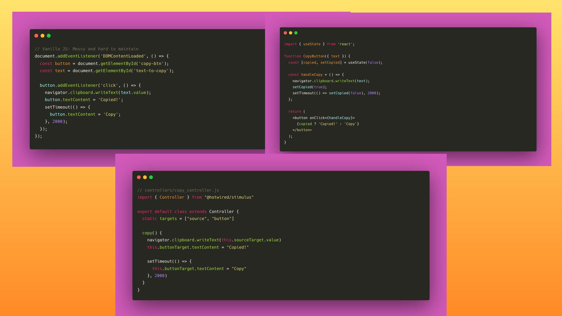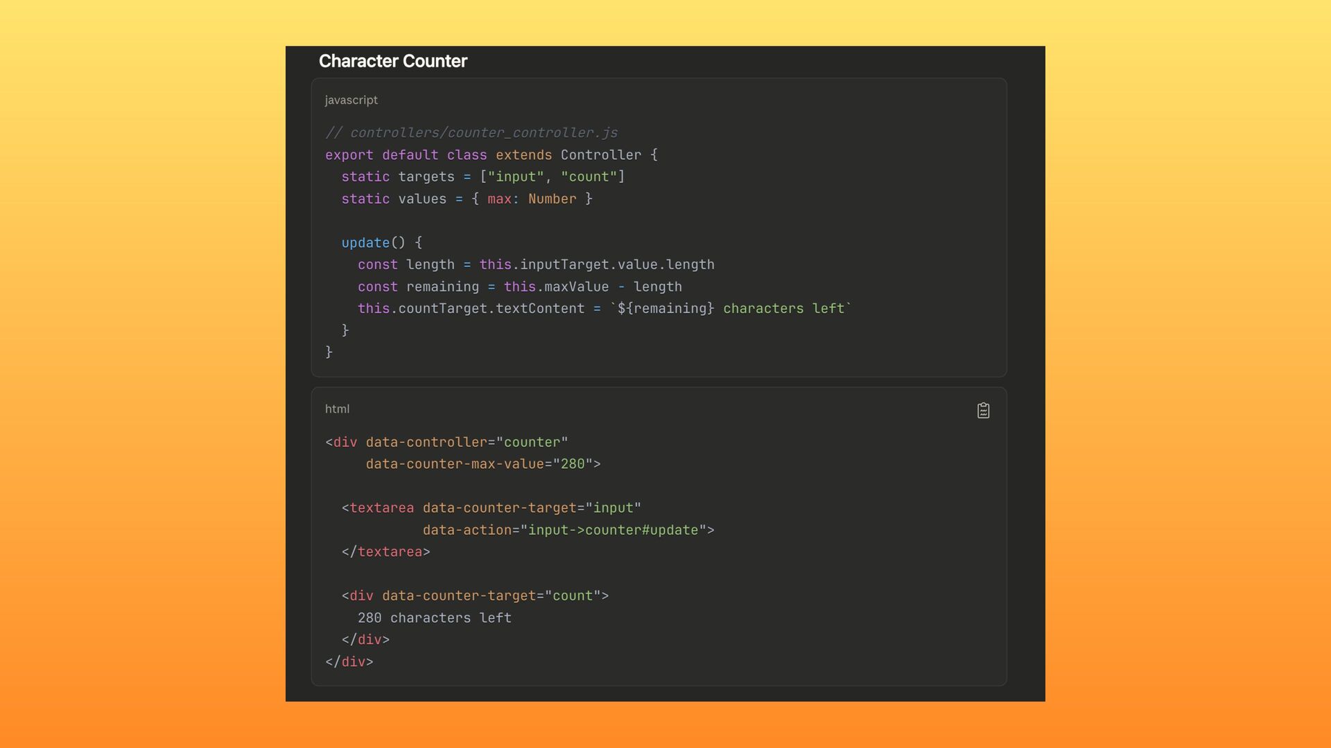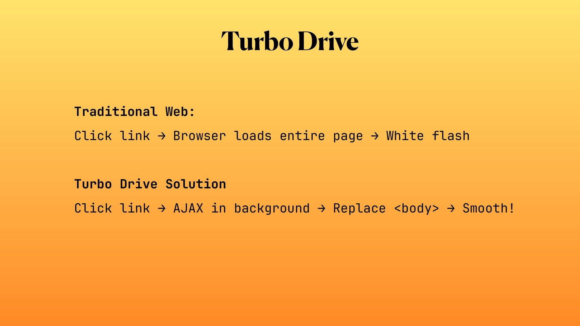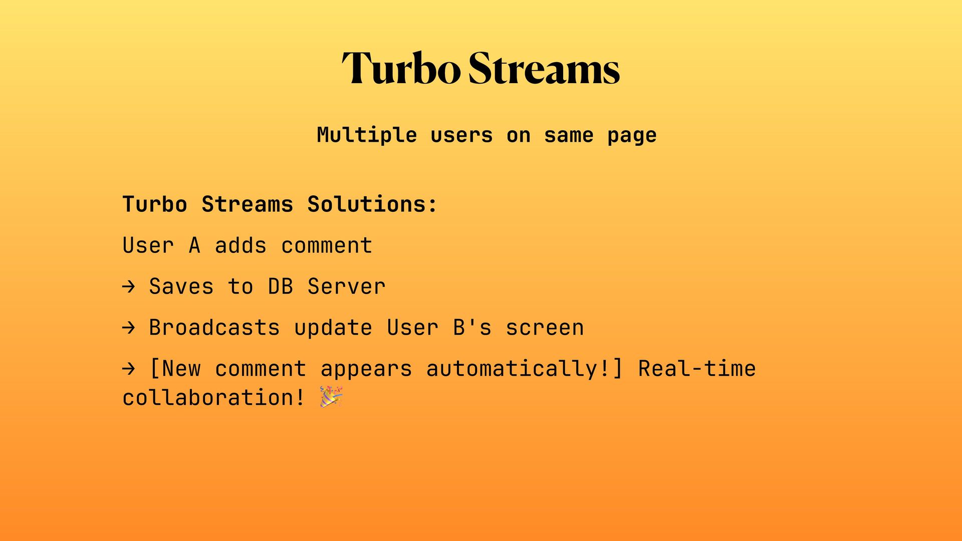 "Edit" 2. Turbo fetches /users/123/edit 3. Server returns full HTML with matching frame: <turbo-frame id="user_profile"> <form> . .. </ form> </ turbo-frame> 4. Only that frame updates! 5. Rest of page untouched ✅