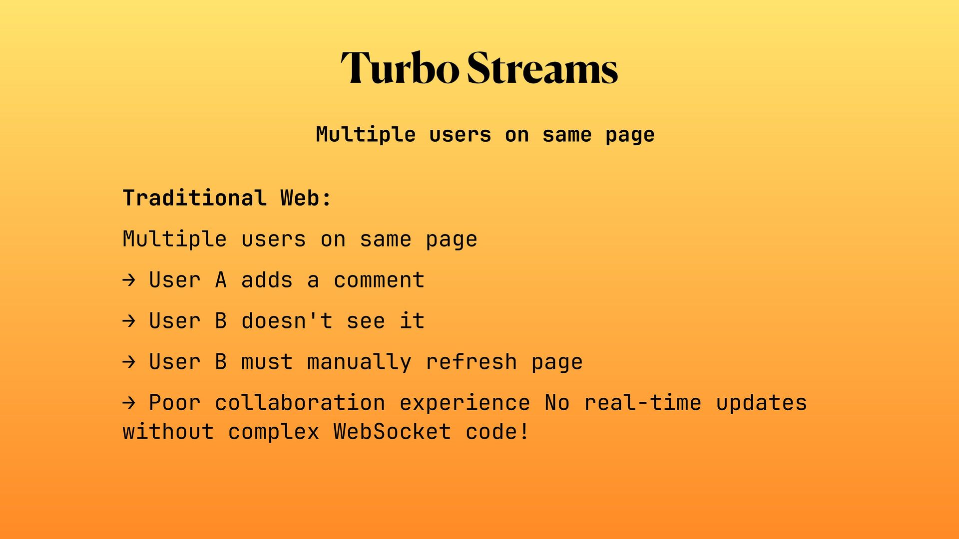 users on same page → User A adds a comment → User B doesn't see it → User B must manually refresh page → Poor collaboration experience No real-time updates without complex WebSocket code!