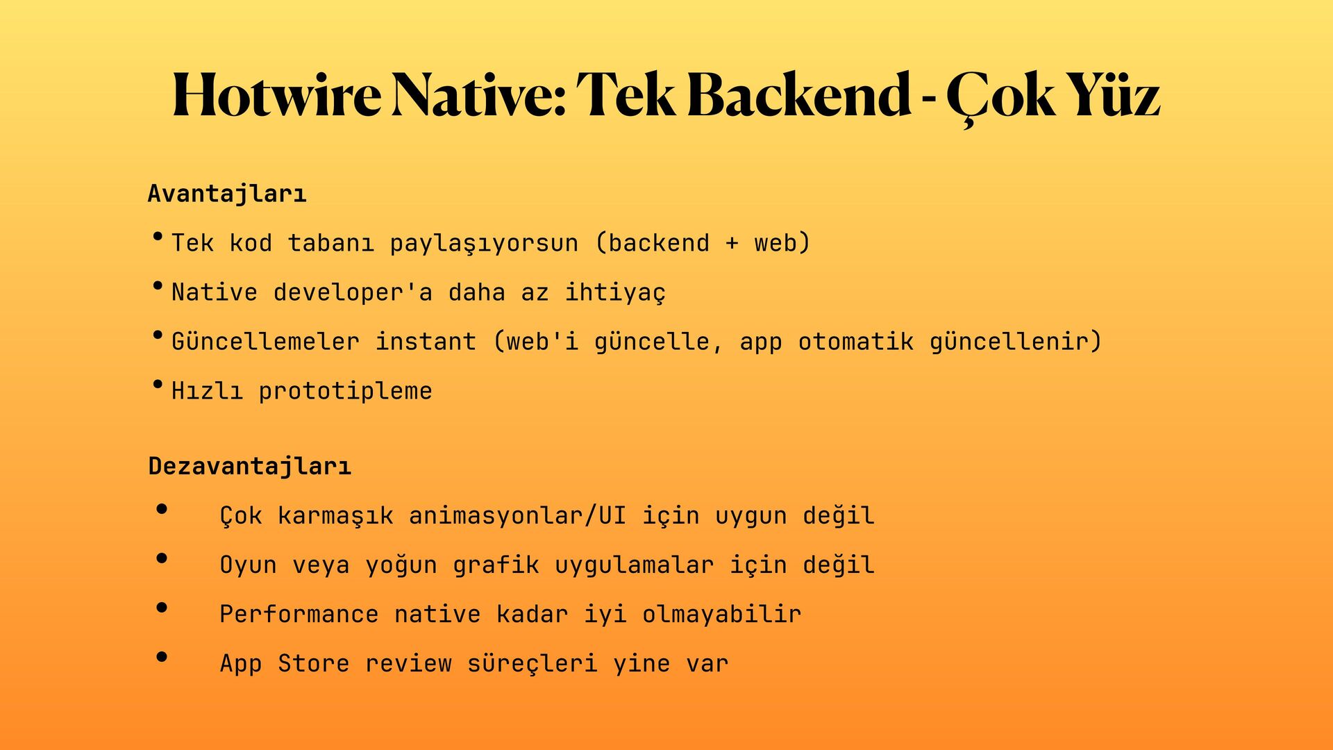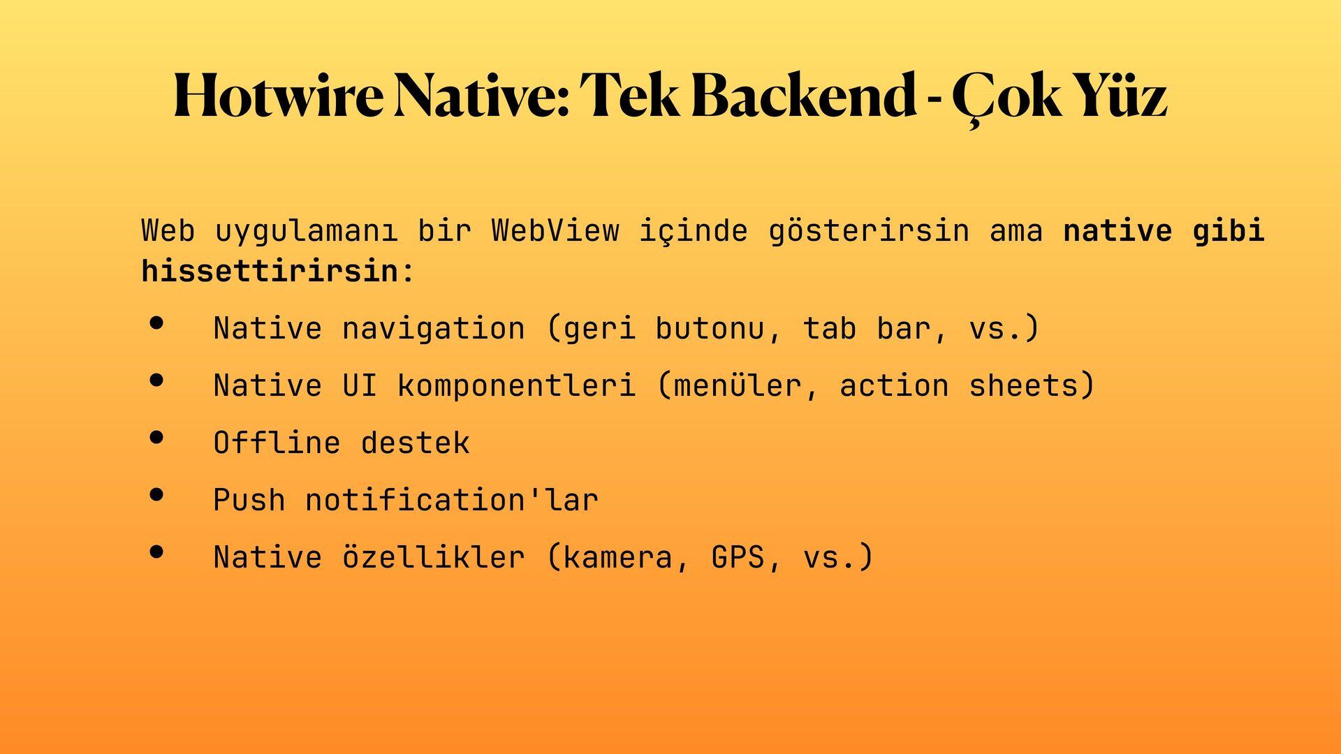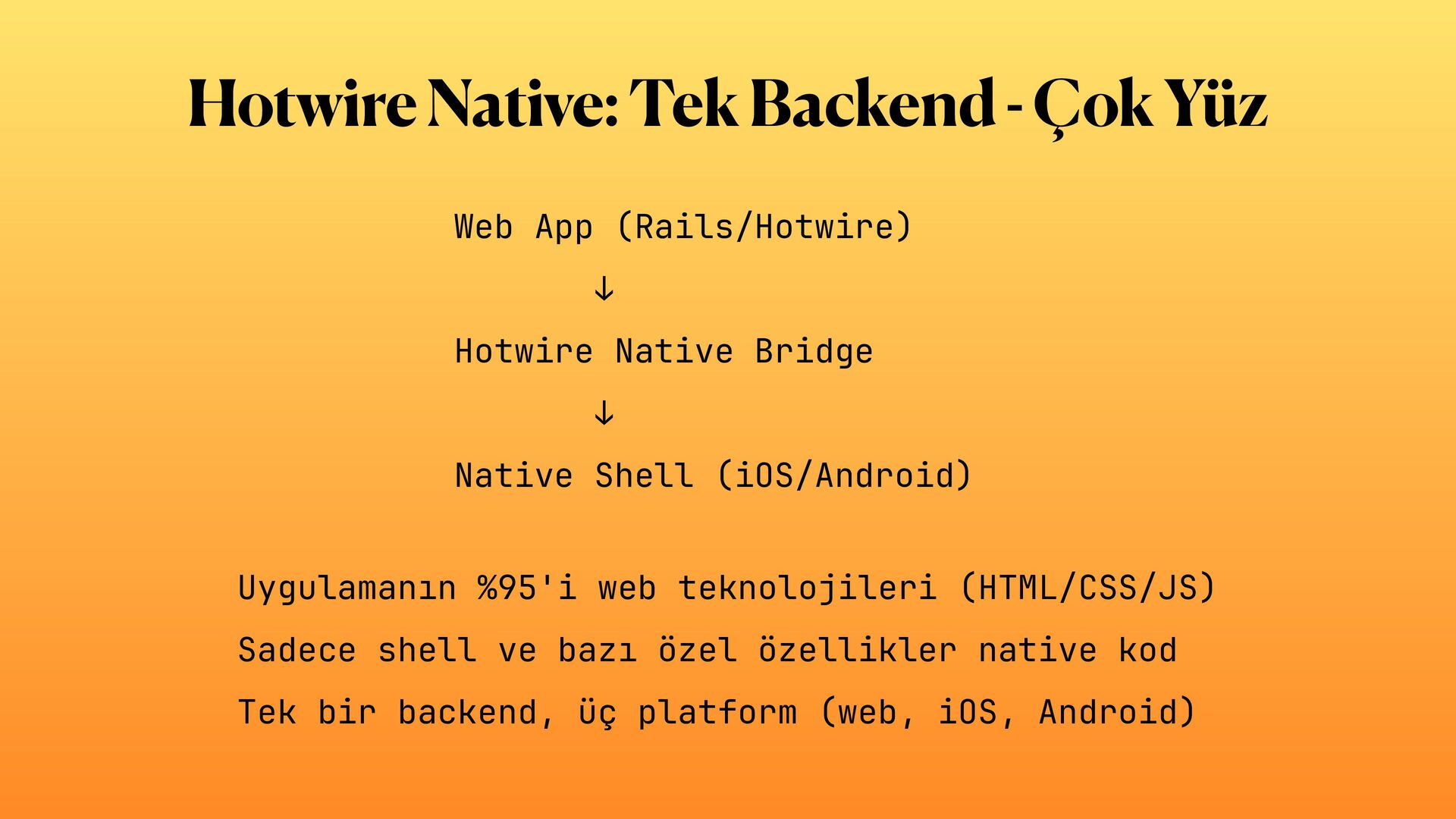↓ Hotwire Native Bridge ↓ Native Shell (iOS/Android) Uygulamanın %95'i web teknolojileri (HTML/CSS/JS) Sadece shell ve bazı özel özellikler native kod Tek bir backend, üç platform (web, iOS, Android)