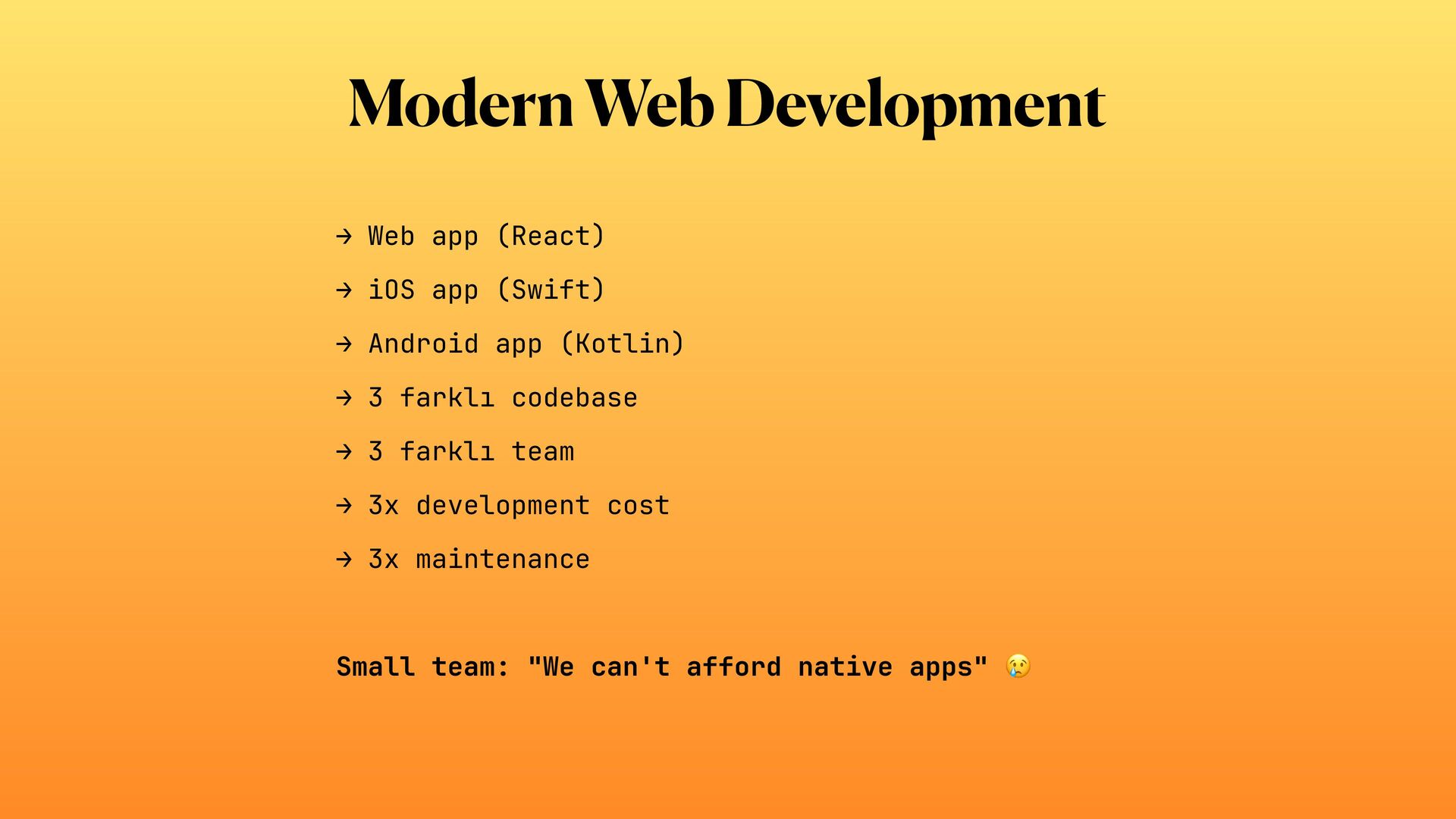 - API endpoints iOS Team: - Swift/SwiftUI - Consume same API - Rebuild all UI logic Android Team: - Kotlin/Jetpack Compose - Consume same API - Rebuild all UI logic again Result: Same feature, 3 times work!