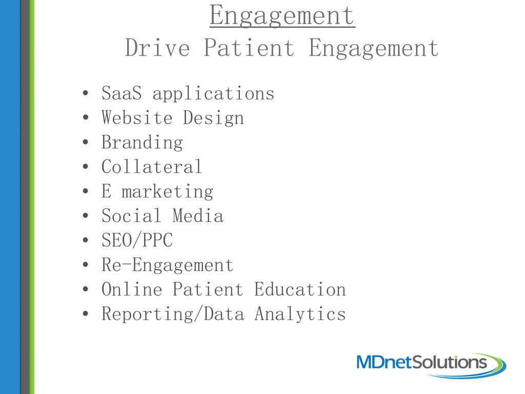 offerings • Detail Services within those offerings • Sales process concepts • Review Potential Markets and Client Types • Discuss scenarios for sales team structure based on preferred markets • NEW FRONTIER: Compliance and Outcomes Management
