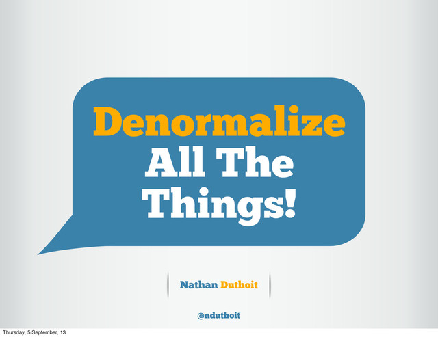 What do you do when you need to cache a model but also need to query the cached data? You denormalize all the things! In this talk (presented at DjangoCon US 2013) we will see how to create and maintain denormalized versions of some of your Django models in order to enjoy the benefits of caching while maintaining the benefits of relational data.