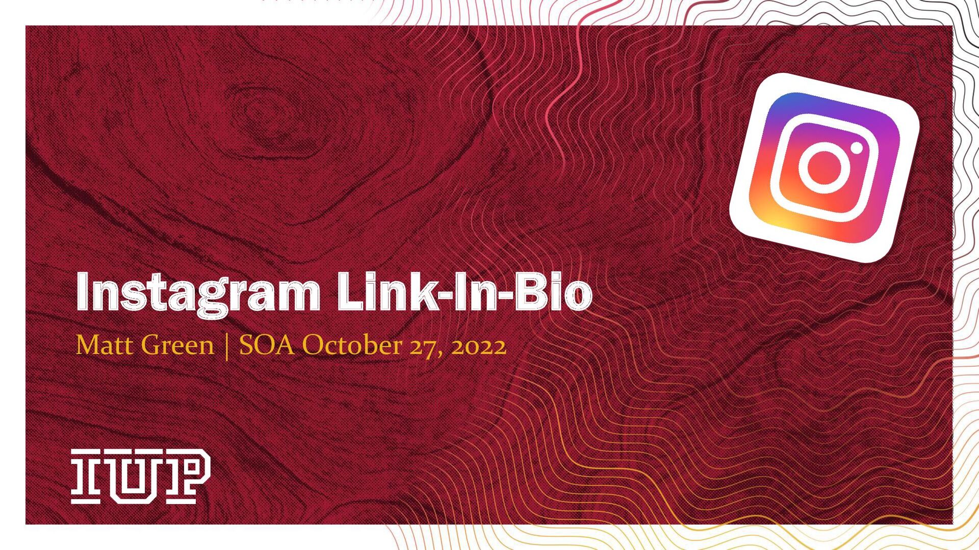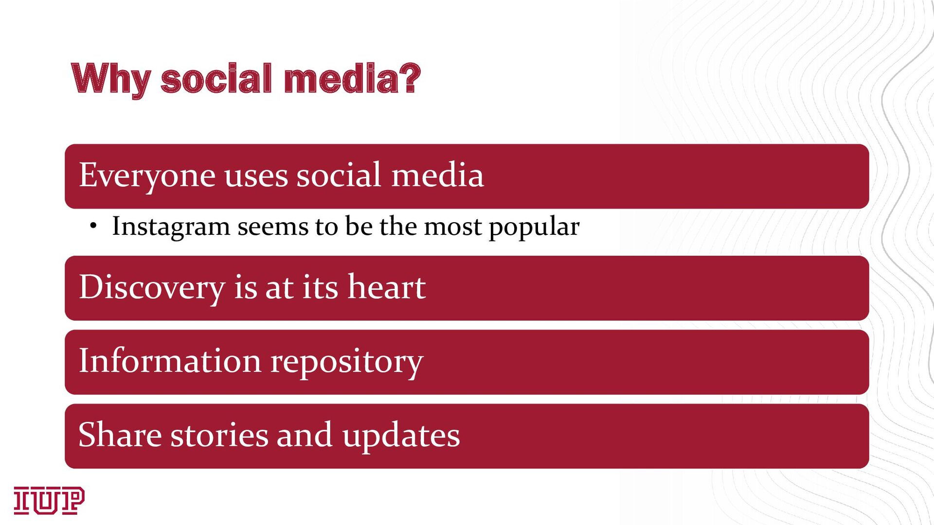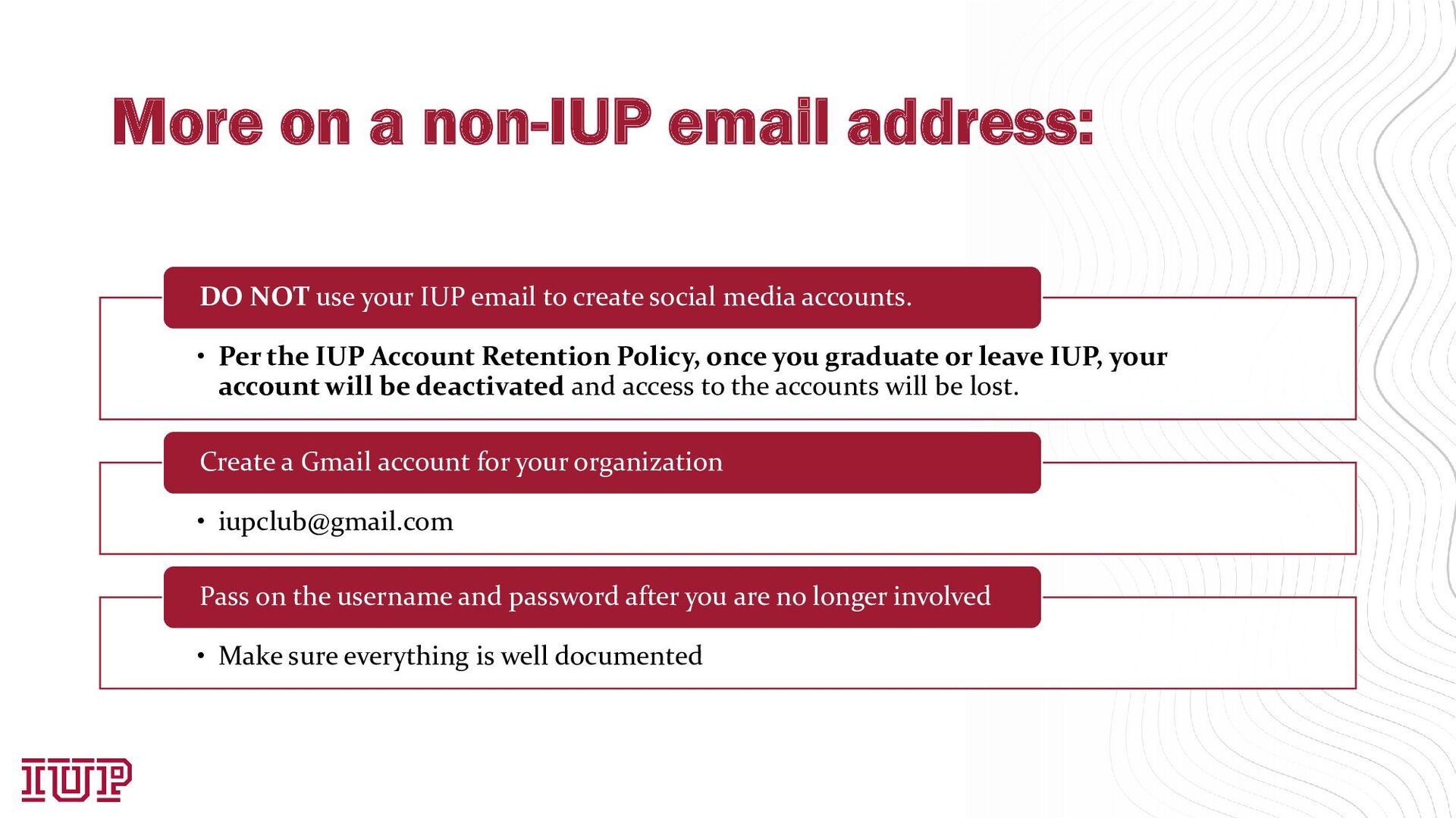 Account Retention Policy, once you graduate or leave IUP, your account will be deactivated and access to the accounts will be lost. DO NOT use your IUP email to create social media accounts. • [email protected] Create a Gmail account for your organization • Make sure everything is well documented Pass on the username and password after you are no longer involved