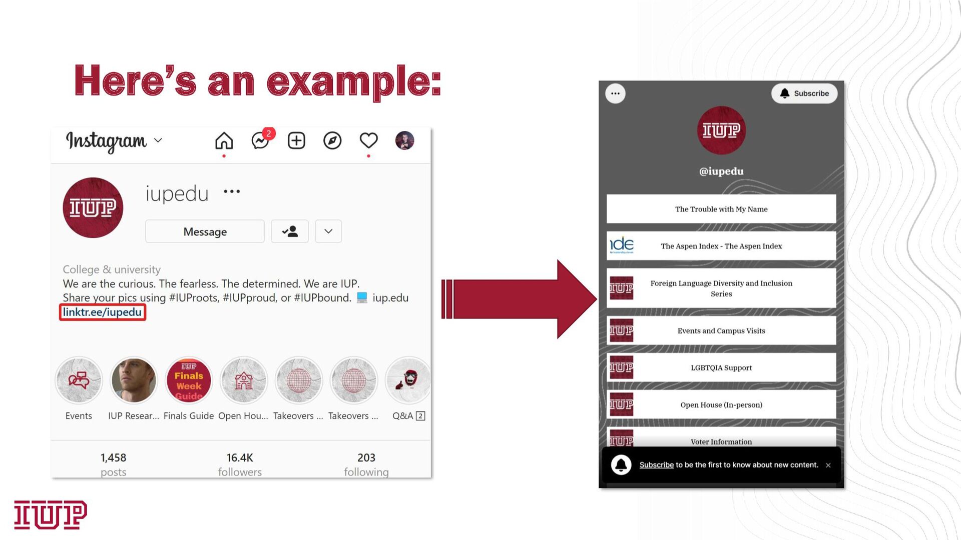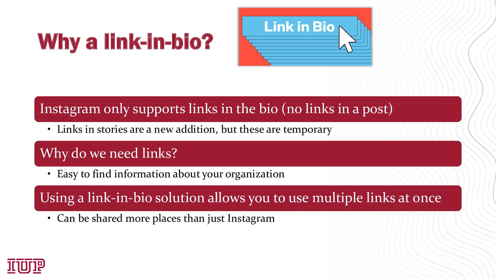 (no links in a post) • Links in stories are a new addition, but these are temporary Why do we need links? • Easy to find information about your organization Using a link-in-bio solution allows you to use multiple links at once • Can be shared more places than just Instagram