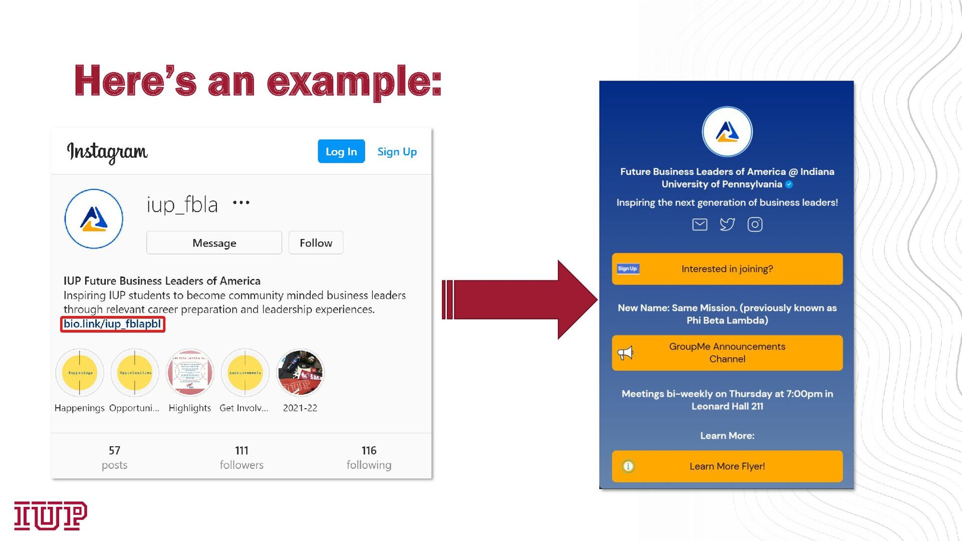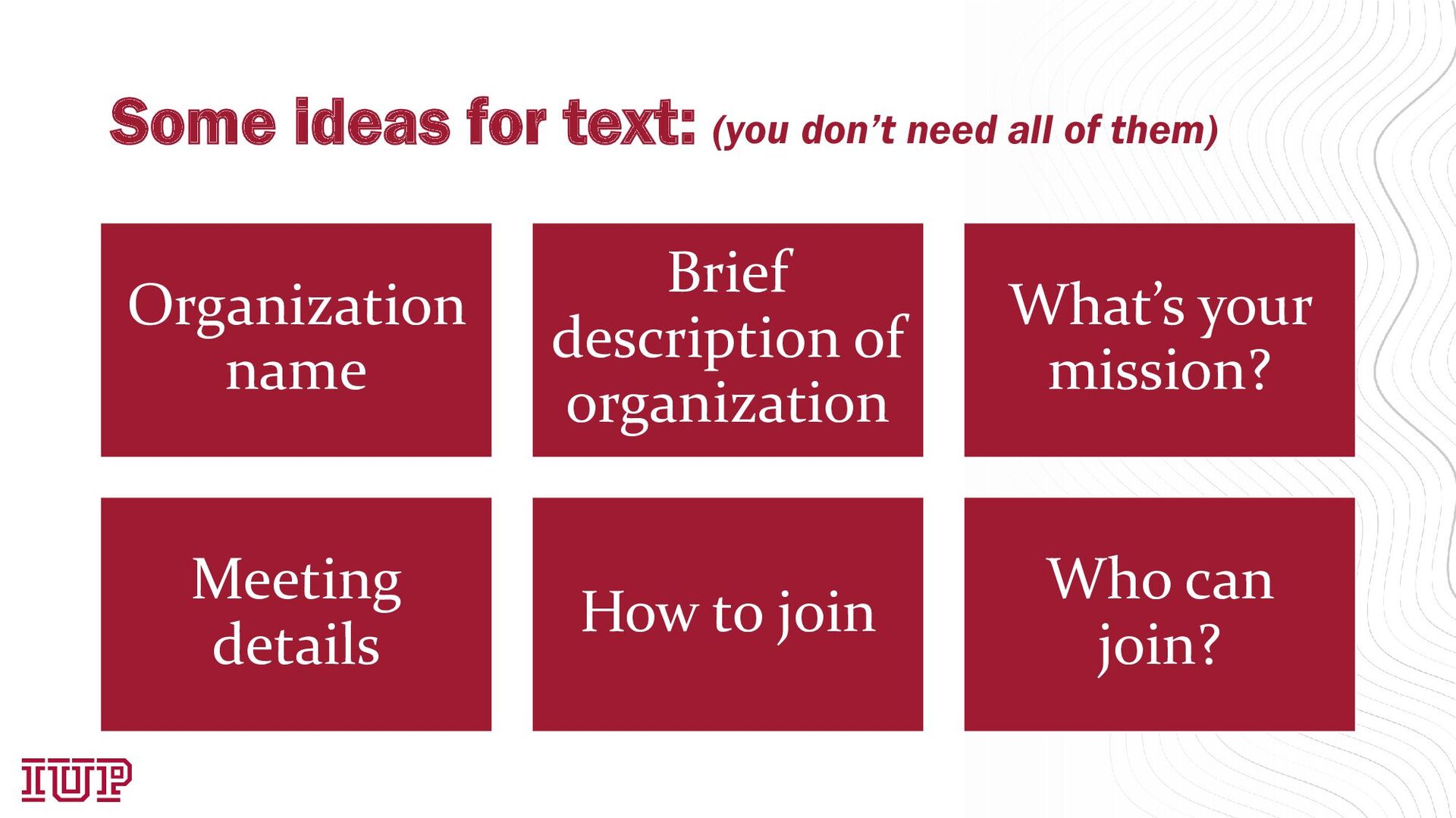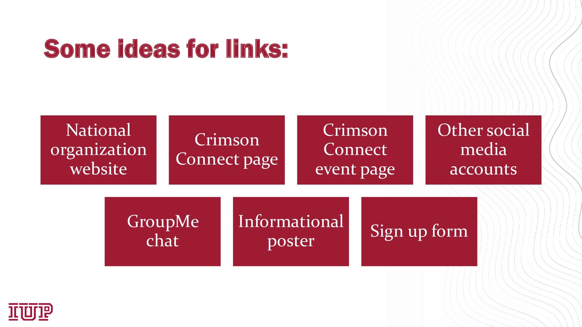 generation have access? A non-IUP email address Crimson Connect, Calendar, GroupMe, etc Plan of what links and text to include Branding is everything! Logos for your organization Tweak the settings to your liking Time to get everything just right