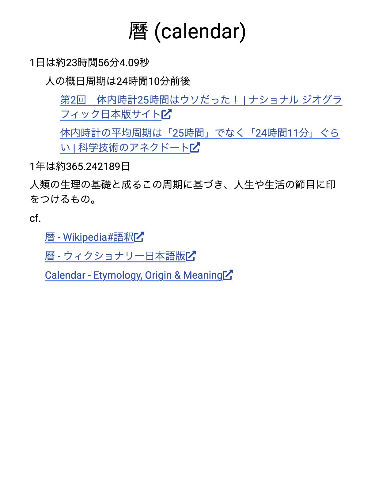 回 体内時計25 時間はウソだった!| ナショナルジオグラ フィック日本版サイト 体内時計の平均周期は「25 時間」でなく「24 時間11 分」ぐら い| 科学技術のアネクドート 1 年は約365.242189 日 人類の生理の基礎と成るこの周期に基づき、人生や生活の節目に印 をつけるもの。 cf. 暦- Wikipedia# 語釈 曆- ウィクショナリー日本語版 Calendar - Etymology, Origin & Meaning