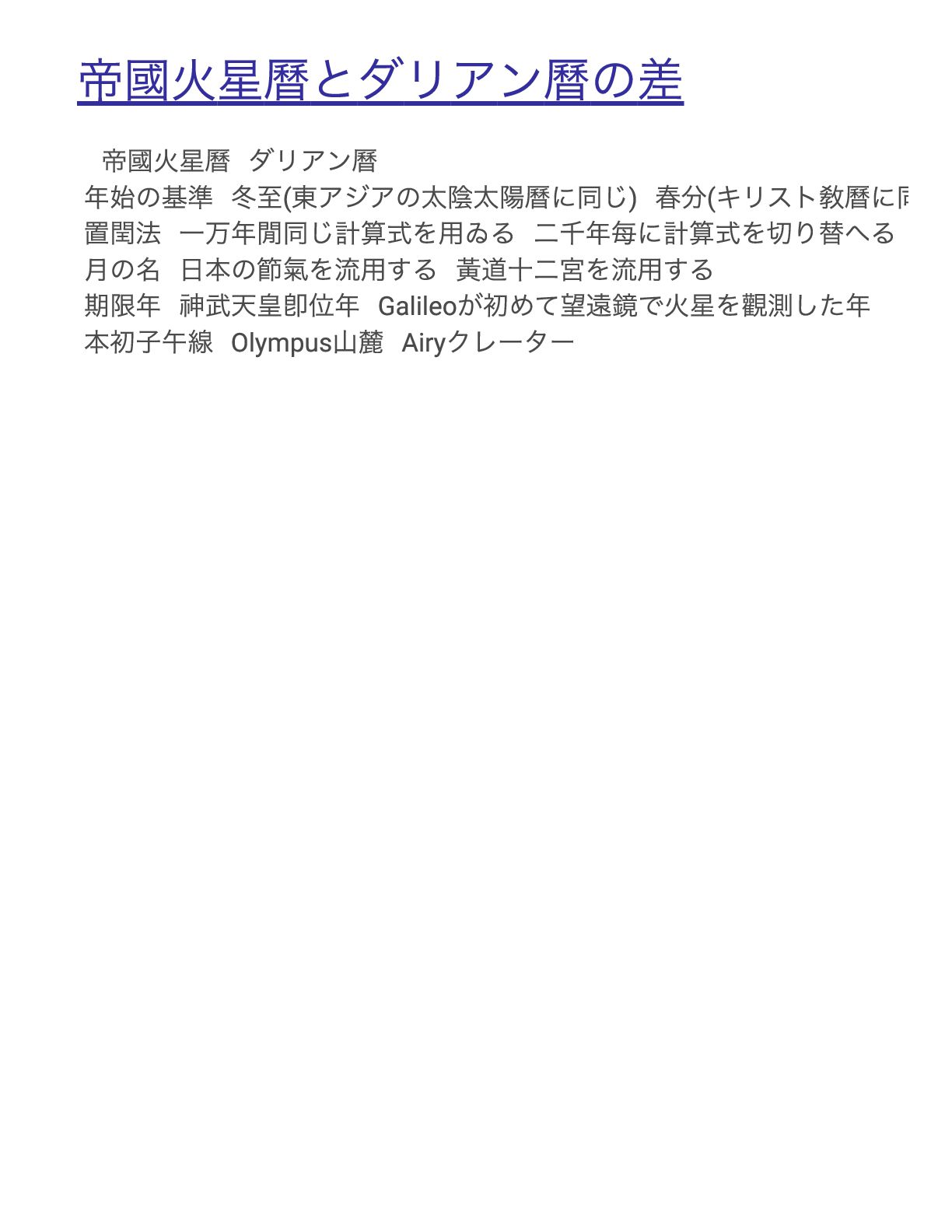 帝國火星曆とダリアン曆の差 帝國火星曆 ダリアン曆 年始の基準 冬至( 東アジアの太陰太陽曆に同じ) 春分( キリスト敎曆に同 置閏法 一万年閒同じ計算式を用ゐる