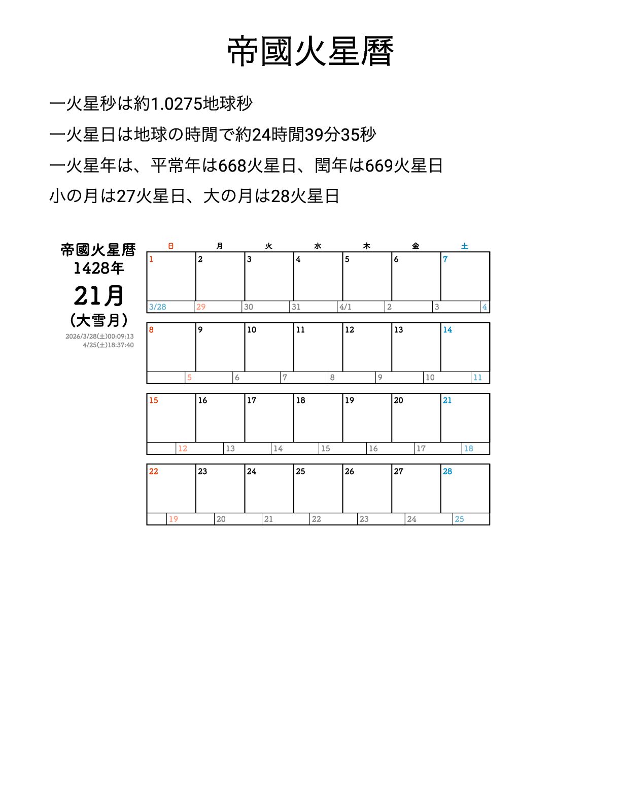 小の月は27 火星日、大の月は28 火星日 帝國⽕星暦 1428年 21⽉ (⼤雪⽉) 2026/3/28(⼟)00:09:13 4/25(⼟)18:37:40 ⽇ ⽉ ⽕ ⽔ ⽊ ⾦ ⼟ 1 2 3 4 5 6 7 8 9 10 11 12 13 14 15 16 17 18 19 20 21 22 23 24 25 26 27 28 3/28 29 30 31 4/1 2 3 4 5 6 7 8 9 10 11 12 13 14 15 16 17 18 19 20 21 22 23 24 25