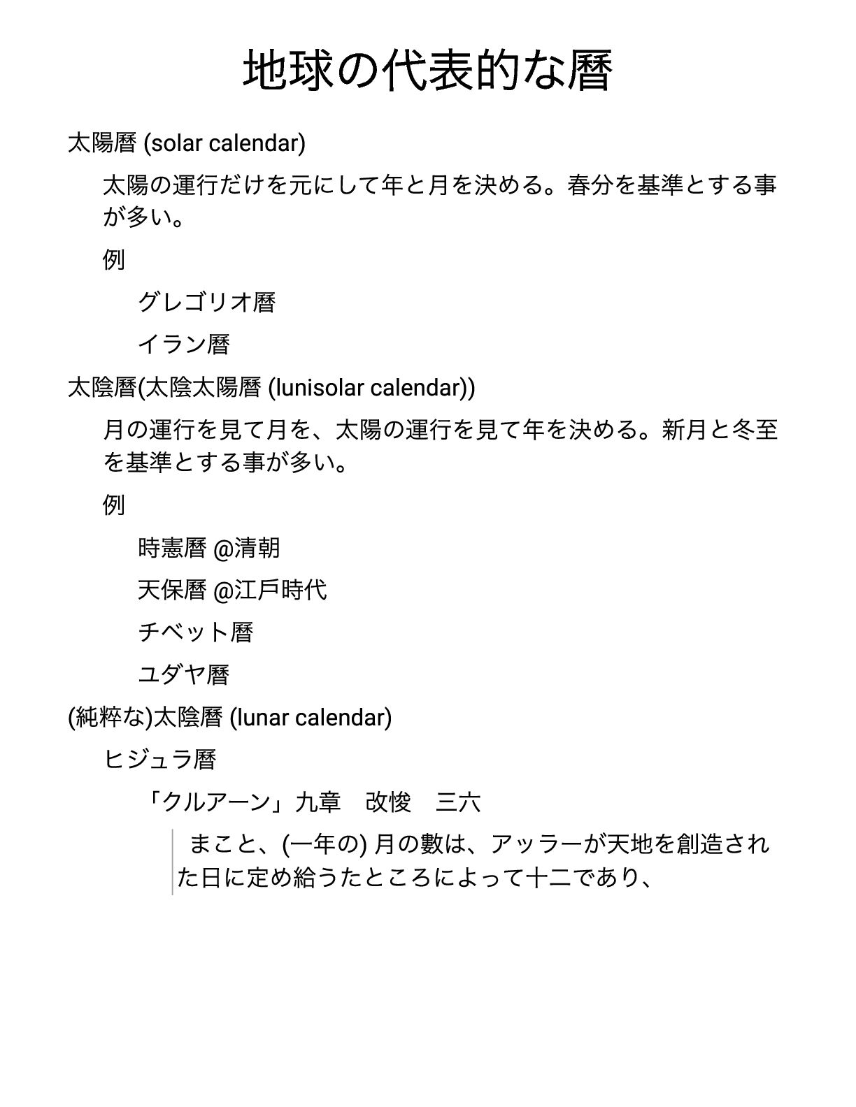 calendar)) 月の運行を見て月を、太陽の運行を見て年を決める。新月と冬至 を基準とする事が多い。 例 時憲曆@ 清朝 天保曆@ 江戶時代 チベット曆 ユダヤ曆 ( 純粹な) 太陰曆(lunar calendar) ヒジュラ曆 「クルアーン」九章 改悛 三六 まこと、( 一年の) 月の數は、アッラーが天地を創造され た日に定め給うたところによって十二であり、