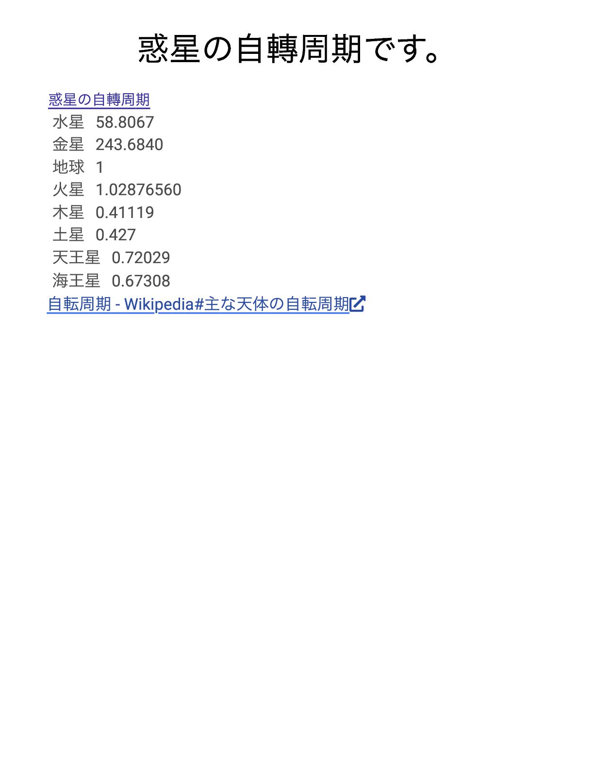 木星 0.41119 土星 0.427 天王星 0.72029 海王星 0.67308 自転周期- Wikipedia# 主な天体の自転周期