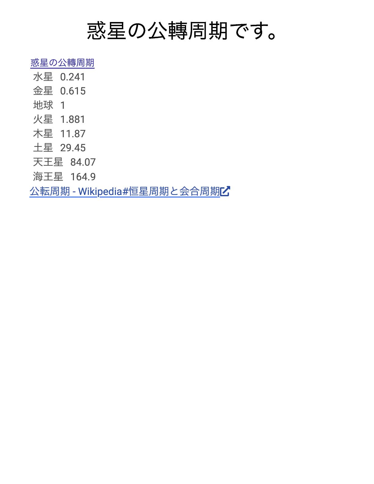 木星 11.87 土星 29.45 天王星 84.07 海王星 164.9 公転周期- Wikipedia# 恒星周期と会合周期