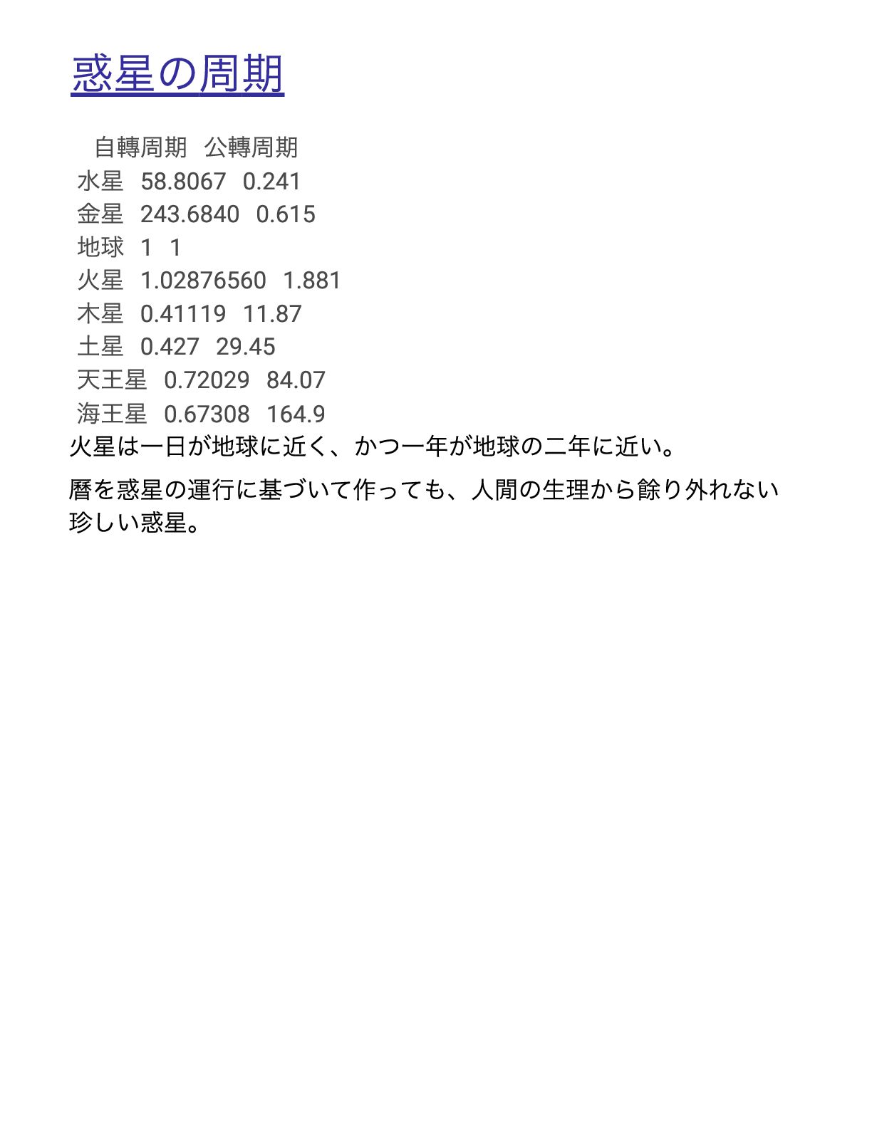 1 1 火星 1.02876560 1.881 木星 0.41119 11.87 土星 0.427 29.45 天王星 0.72029 84.07 海王星 0.67308 164.9 火星は一日が地球に近く、かつ一年が地球の二年に近い。 曆を惑星の運行に基づいて作っても、人閒の生理から餘り外れない 珍しい惑星。