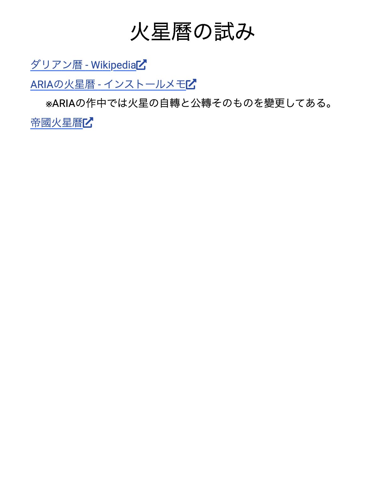 火星曆の試み ダリアン暦- Wikipedia ARIA の火星暦- インストールメモ ※ARIA の作中では火星の自轉と公轉そのものを變更してある。 帝國火星曆