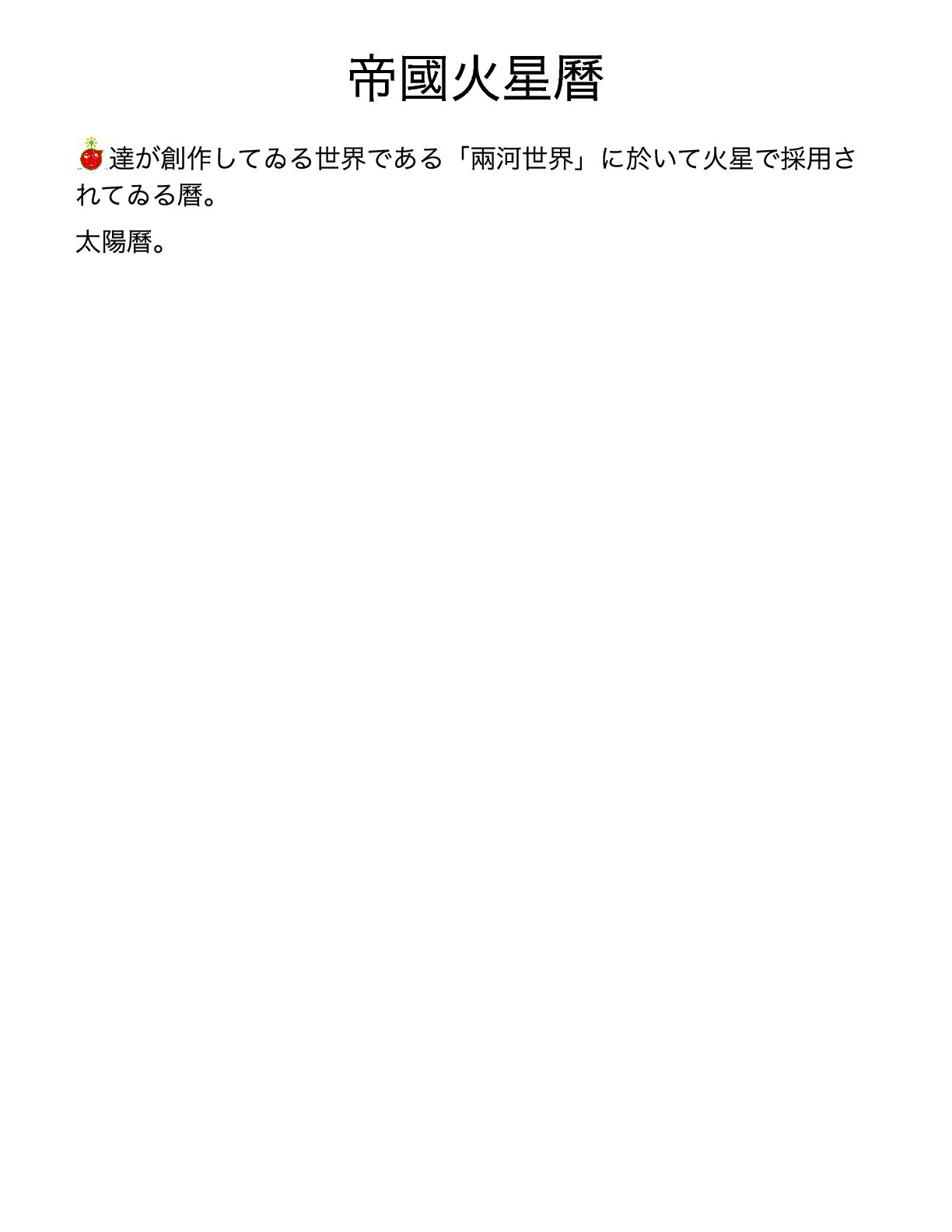 帝國火星曆 達が創作してゐる世界である「兩河世界」に於いて火星で採用さ れてゐる曆。 太陽曆。