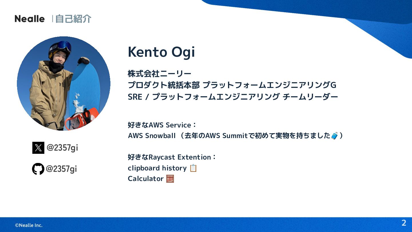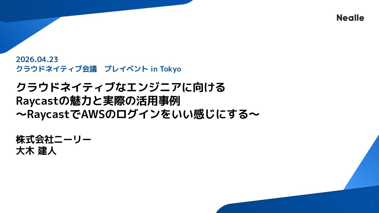 クラウドネイティブなエンジニアに向ける Raycastの魅力と実際の活用事例 〜RaycastでAWSのログインをいい感じにする〜 株式会社ニーリー 大木 建人 2026.04.23 クラウドネイティブ会議 プレイベント in Tokyo