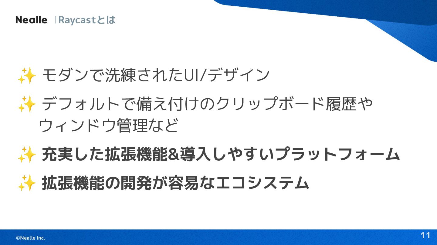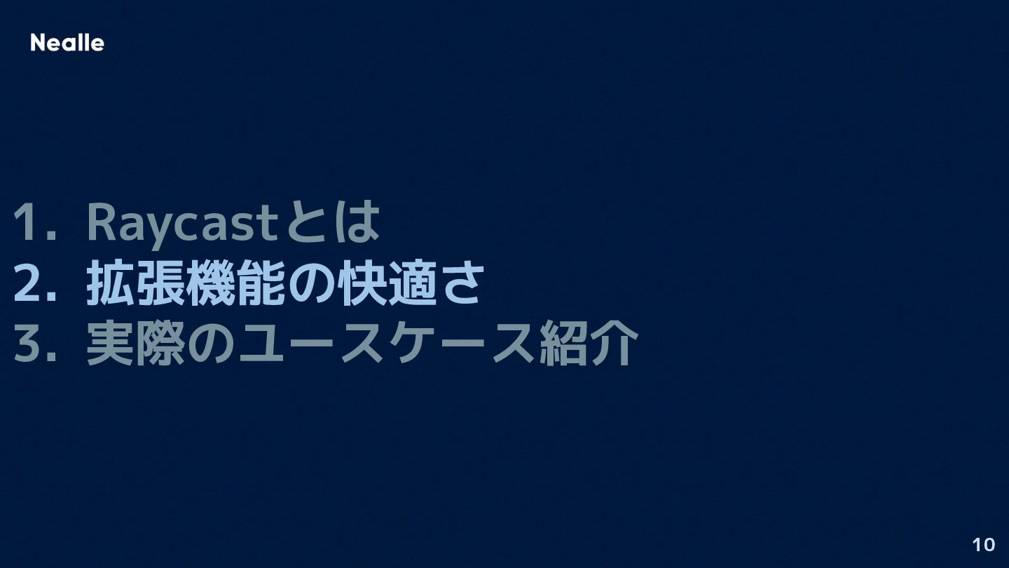 10 1. Raycastとは 2. 拡張機能の快適さ 3. 実際のユースケース紹介