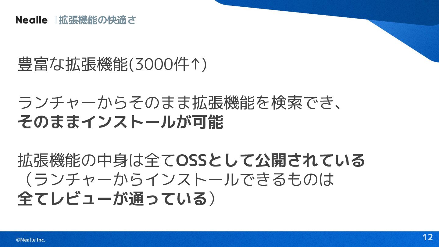 12 拡張機能の快適さ 豊富な拡張機能(3000件↑) ランチャーからそのまま拡張機能を検索でき、 そのままインストールが可能 拡張機能の中身は全てOSSとして公開されている (ランチャーからインストールできるものは 全てレビューが通っている)
