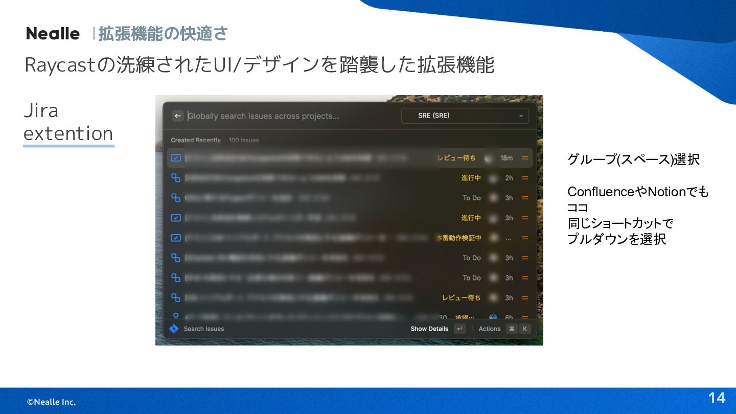 14 拡張機能の快適さ Jira extention Raycastの洗練されたUI/デザインを踏襲した拡張機能 グループ(スペース)選択 ConfluenceやNotionでも ココ 同じショートカットで プルダウンを選択