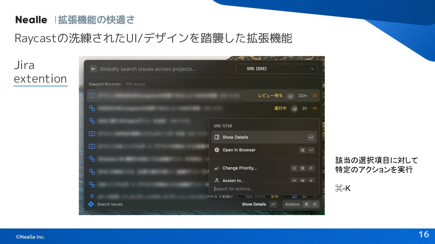 16 拡張機能の快適さ Jira extention Raycastの洗練されたUI/デザインを踏襲した拡張機能 該当の選択項目に対して 特定のアクションを実行 ⌘-K