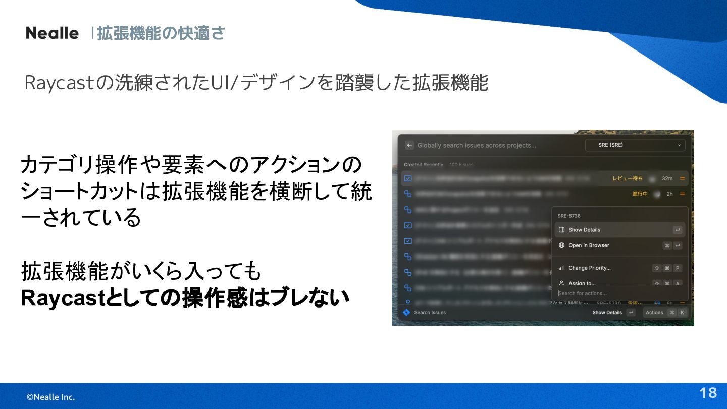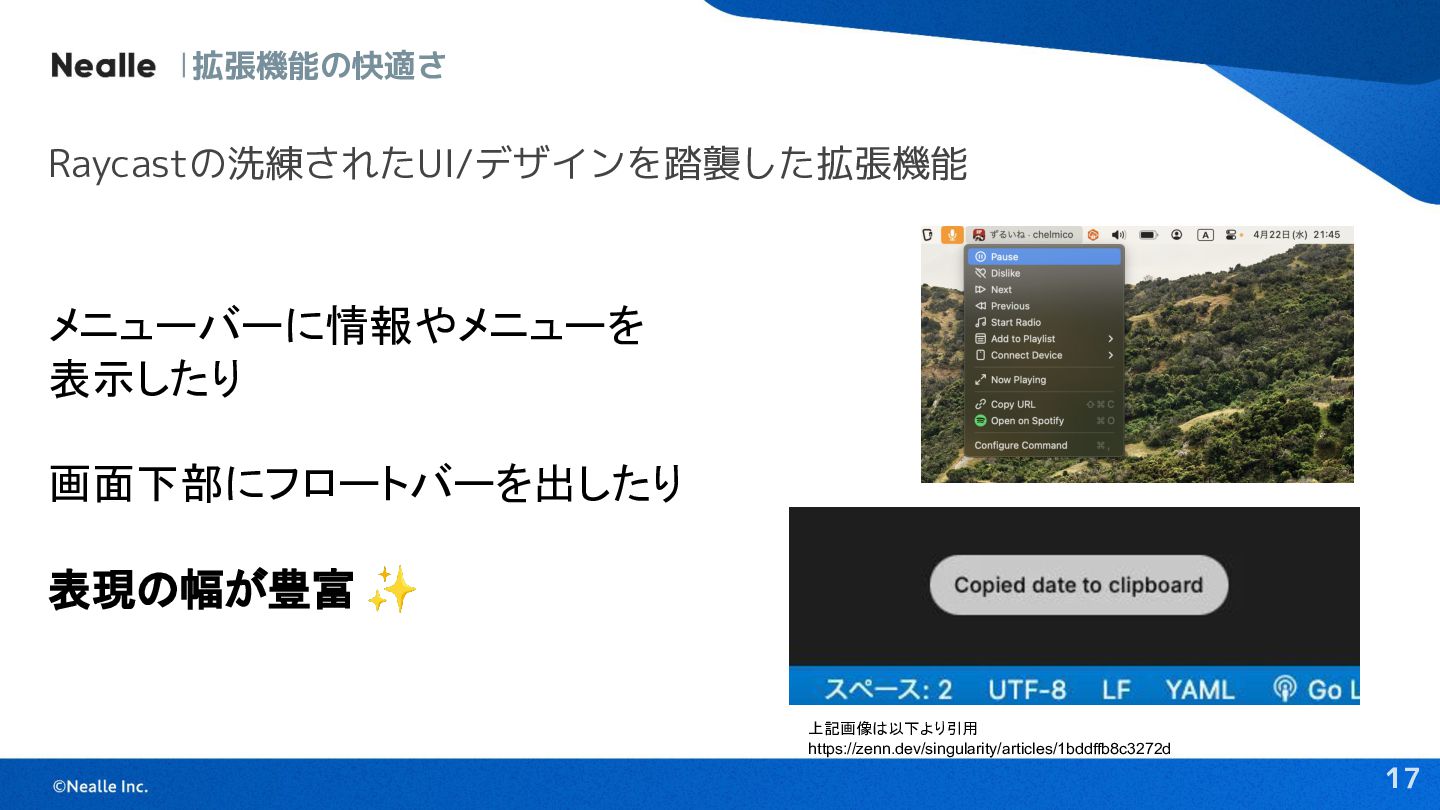 17 拡張機能の快適さ Raycastの洗練されたUI/デザインを踏襲した拡張機能 メニューバーに情報やメニューを 表示したり 画面下部にフロートバーを出したり 表現の幅が豊富 ✨ 上記画像は以下より引用 https://zenn.dev/singularity/articles/1bddffb8c3272d