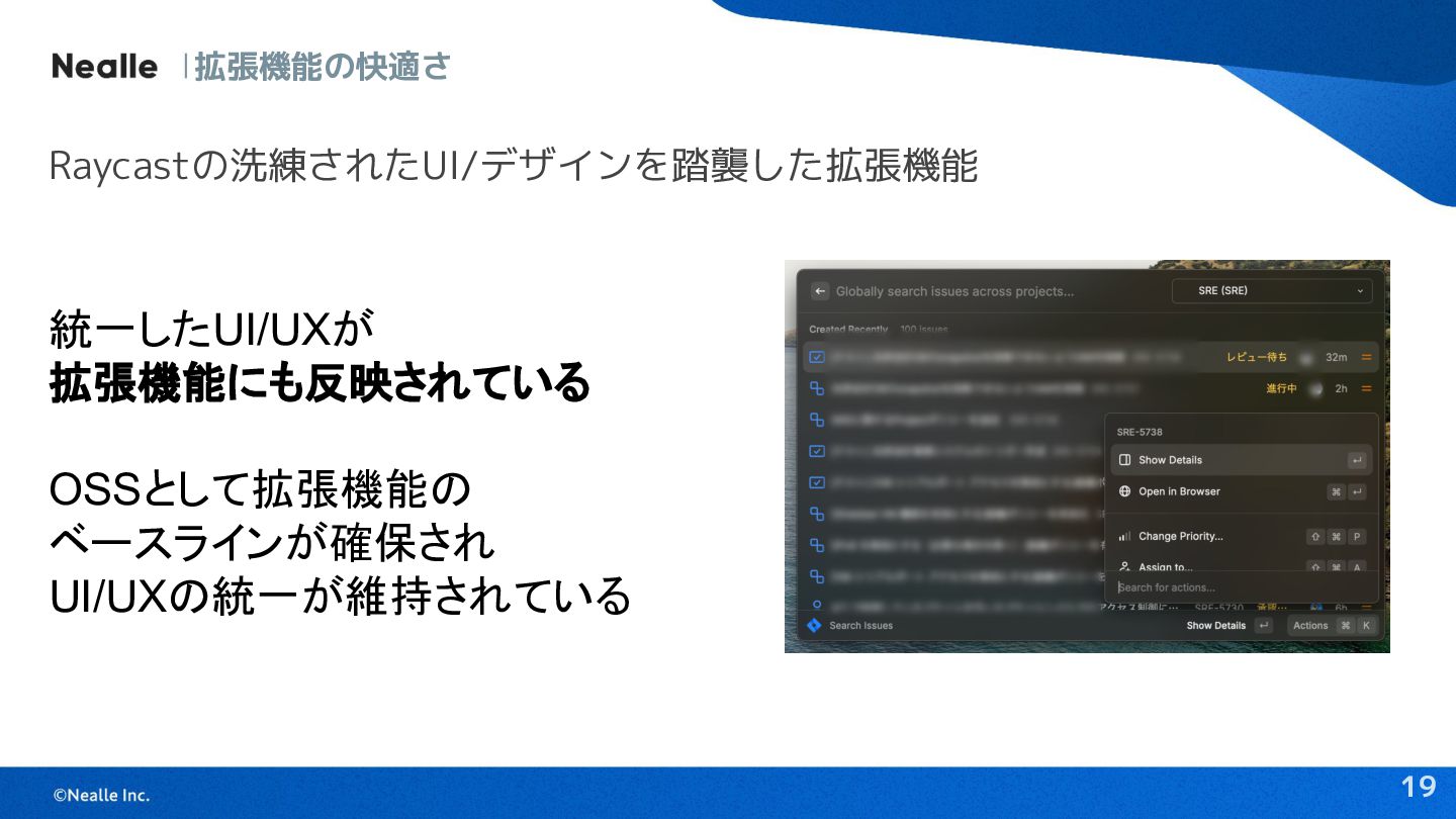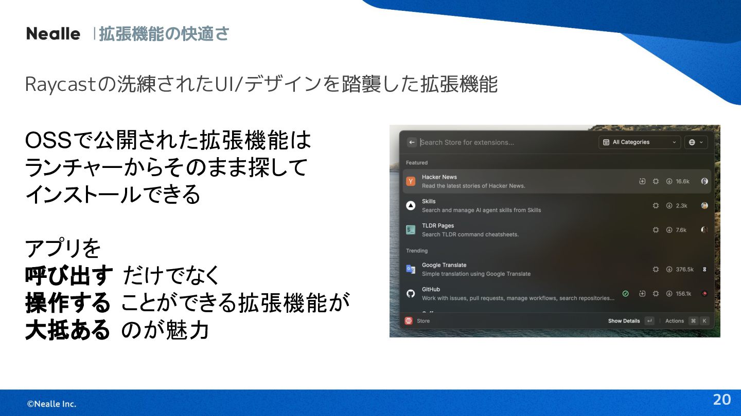 19 拡張機能の快適さ Raycastの洗練されたUI/デザインを踏襲した拡張機能 統一したUI/UXが 拡張機能にも反映されている OSSとして拡張機能の ベースラインが確保され UI/UXの統一が維持されている