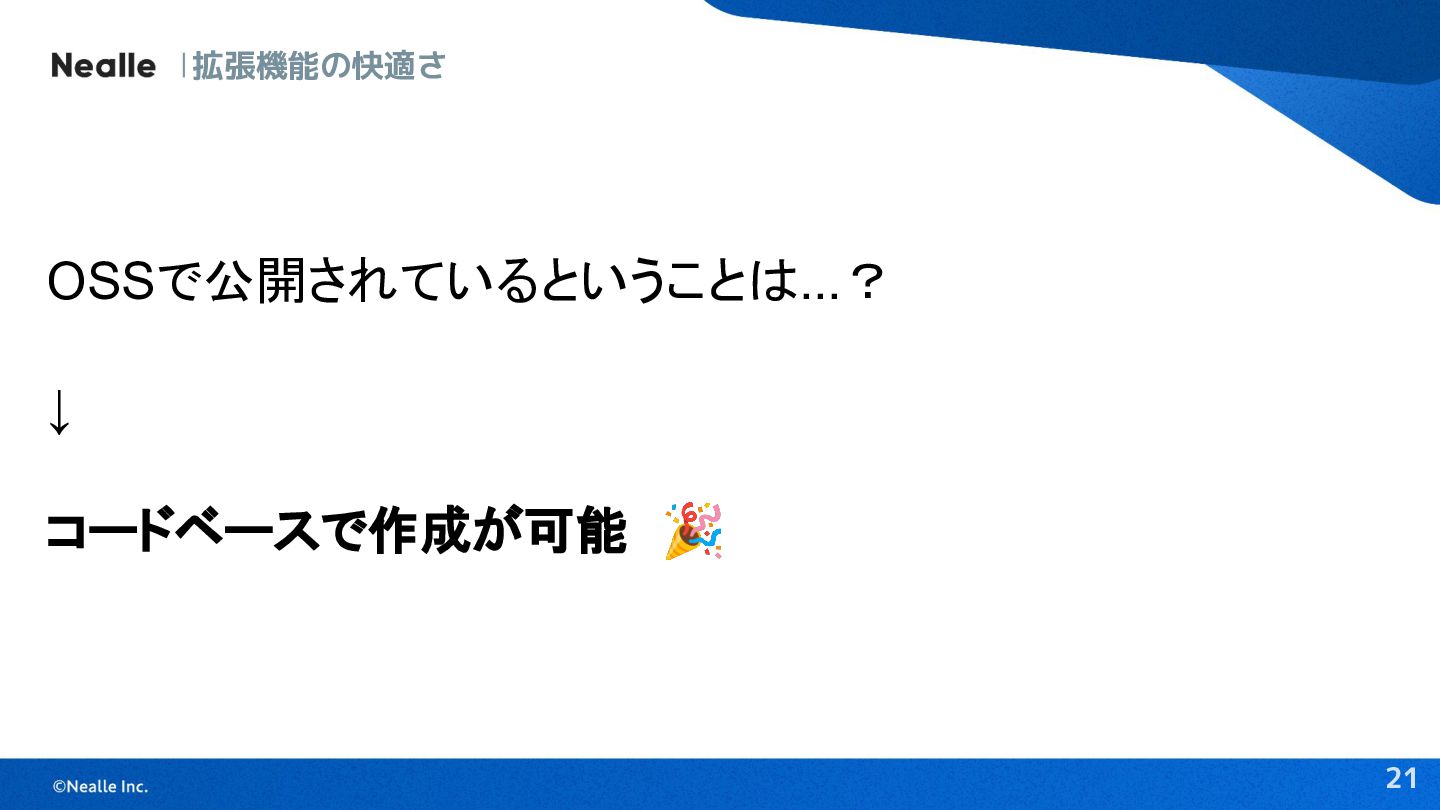 21 拡張機能の快適さ OSSで公開されているということは...? ↓ コードベースで作成が可能 🎉