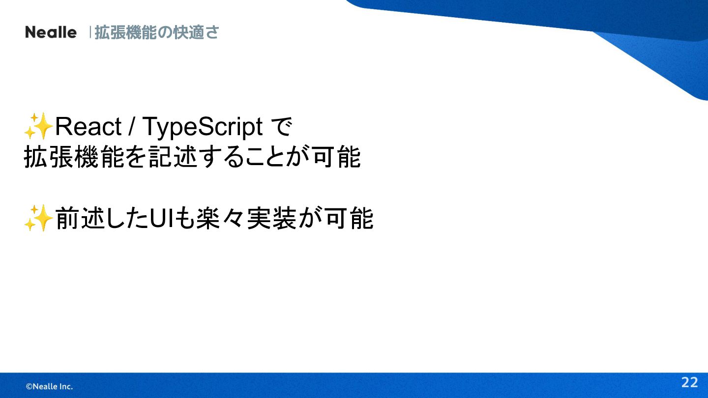 22 拡張機能の快適さ ✨React / TypeScript で 拡張機能を記述することが可能 ✨前述したUIも楽々実装が可能