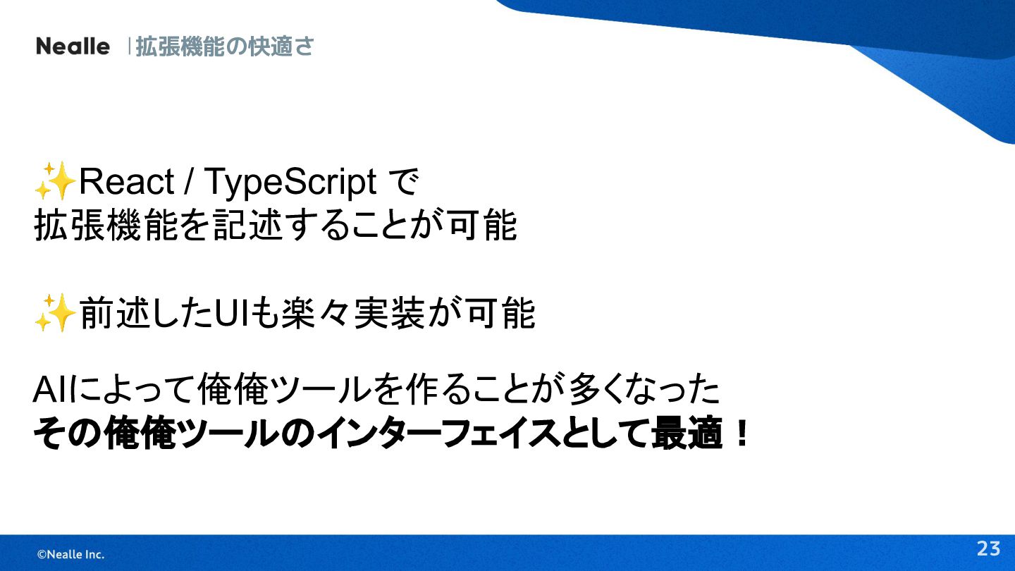 23 拡張機能の快適さ ✨React / TypeScript で 拡張機能を記述することが可能 ✨前述したUIも楽々実装が可能 AIによって俺俺ツールを作ることが多くなった その俺俺ツールのインターフェイスとして最適!