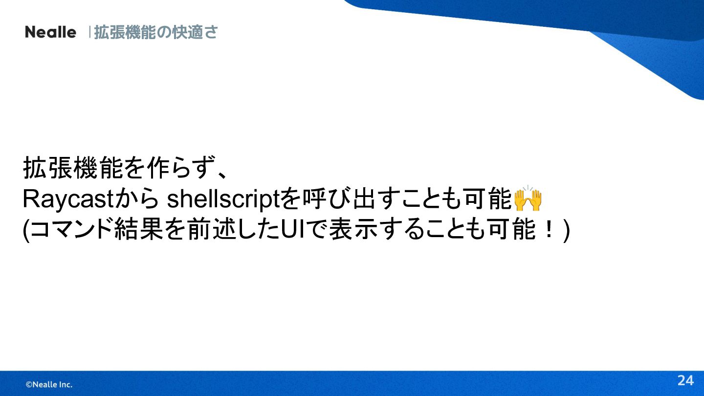 24 拡張機能の快適さ 拡張機能を作らず、 Raycastから shellscriptを呼び出すことも可能🙌 (コマンド結果を前述したUIで表示することも可能!)